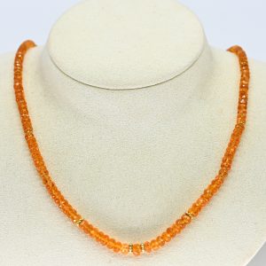 Collier mit Citrin, Goldschmiedearbeit, 21. Jahrhundert100,00 €Stamped: 750/- yellow gold; s-shaped clasp, capsules and 12 spacer links; total weight: approx. 21.3 g; graduated arrangement of compressed spherical citrines with circumferential diamond-shaped facets; cognac-coloured variety; diameter: approx. 3.6 mm to approx. 5.5 mm; overall length: approx. 48 cm.
