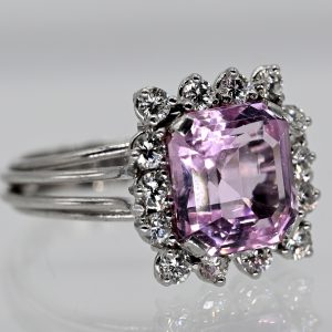 Cocktailring mit Morganit ca. 5 ct und 14 Brillanten, zus. ca. 0,9 ct, Juwelierarbeit, 90er Jahre850,00 €Stamped: 585/- white gold; total weight: approx. 6.5 g; high-rectangular design with stepped prong settings; centrally set morganite approx. 5 ct (dimensions: approx. 10.8 x 10 mm; height: approx. 6.76 mm); intense pink colour variety; cushion cut; framed by 14 brilliant-cut diamonds, total approx. 0.9(4) ct; colour: G-I (middle range); clarity: VVS-SI (upper range); dimensions of the ring head: approx. 15.8 x 15.4 mm; height: approx. 8.4 mm; four-part fanned shank made of curved round wire with lateral flow; ring size: approx. 53.5.