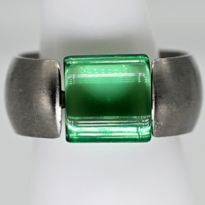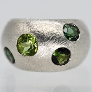 Moderner Ring mit grünen Turmalinen, Goldschmiedearbeit, N. M., 21. Jh.420,00 €Stamped: 925/- silver; total weight: approx. 17.3 g; convex ring band tapering towards the back with satin-finished surface decoration; four set round faceted tourmalines in various green colour varieties; diameter of the stones: from approx. 5.2 mm to approx. 6.3 mm; ring size: approx. 54.