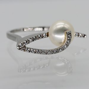 Avantgardistischer Ring mit Akoya-Perle und 18 Melée-Brillanten, Juwelierarbeit, 20. Jh.580,00 €Stamped: 585/- white gold and an unidentified stamp ABS; total weight: approx. 5.8 g; side view in stylised pagoda form; top view of the ring head in a narrow, raised linear arch form; 18 pavé-set melee brilliant-cut diamonds, total approx. 0.08 ct; colour and clarity: upper range; laterally set cream-coloured Akoya pearl with silver-grey lustre, slightly compressed spherical form; dimensions of the ring head: approx. 12.4 x 29.1 mm; height: approx. 11.8 mm; ring size: 58.