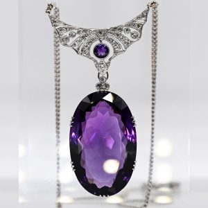 Großer Amethyst-Anhänger mit ca. 31 Diamanten besetzter Bekrönung, Collierkette und Verschluss, Marriage aus verschiedenen Epochen1.600,00 €Pendant, stamped: 585/- white gold; total weight of the collier: approx. 31.1 g; amethyst set in a high-oval format, dimensions: approx. 35.5 x 23.4 mm; height: approx. 13 mm; intense violet colour variety; leaf-like pierced setting border and six prongs in stylised elongated floral form with linearly engraved contour lines; suspended from a crescent-shaped crown with geometric saw-cut decoration and fine milgrain edges; set with approx. 31 melee and old-cut diamonds, total approx. 0.4 ct; colour and clarity: middle to lower range; centrally a round, faceted-set amethyst, diameter: approx. 4.8 mm; silver curb-link collier chain with an antique small clasp, probably white gold with small diamonds; dimensions of the central element: length: approx. 6 cm; width: approx. 3.5 cm; total collier length: approx. 43.5 cm.