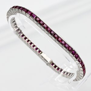 Rivière-Armband mit 55 sehr feinen Rubin-Carrées, zus. ca. 80,49 ct, hochwertige Juwelierarbeit, 80er Jahre2.600,00 €Stamped: 750/- white gold; total weight: approx. 24.6 g; 55 individually, linearly set carré-cut rubies, total approx. 80.49 ct (according to engraved inscription on the inside of the safety clasp); very fine colour variety in red with occasional red-violet nuances; few recognisable, localised, visible natural inclusions; both sides of the bracelet decorated with finely engraved wave-shaped decorative engraving; concealed box clasp with underside safety clasp; width of the bracelet: approx. 4.2 mm; total length: approx. 18.5 cm; one carré-cut ruby with a barely visible, localised polishing mark.