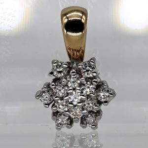 Kleiner Anhänger mit 13 Brillanten, zus. ca. 0,13 ct, Juwelier Christ, 21. Jh.240,00 €Stamped: 585/- yellow and white gold; total weight: approx. 1.9 g; individual prong settings arranged in a rosette form in white gold; fixed triangular bail in yellow gold; set with 13 brilliant-cut diamonds, total approx. 0.13 ct; colour and clarity: upper range; diameter of the rosette: approx. 9.9 mm; height: approx. 7.3 mm; total length incl. triangular bail: approx. 15.3 mm.