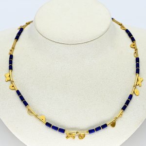 Collier mit Lapislazuli- und Goldelementen, Goldschmiedearbeit, 21. Jh.280,00 €Stamped: 750/- yellow gold; S-shaped clasp, hinge, disc, bead and various plate elements; total weight: approx. 17 g; divided into ten segments by lapis lazuli hinge elements; flexible in construction; width of the elements: approx. 6.7 mm; diameter of the lapis lazuli elements: approx. 3.1 mm; overall length: approx. 43.5 cm.
