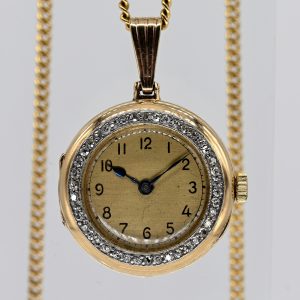 Uhrenanhänger mit Melée-besetzter Lünette und Rundpanzercollierkette, 20. Jh.680,00 €Both stamped: 585/- yellow gold, two different gold tones; total weight: approx. 18.4 g; round watch case with applied triangular bail; bezel set with approx. 42 melee diamonds; gold-coloured dial with black Arabic numeral indices and blued hands; diameter without crown and bail: approx. 23.8 mm; movement modern and later installed; no guarantee for movement or functionality; plain round curb-link collier chain with spring-ring clasp; total length: approx. 60 cm