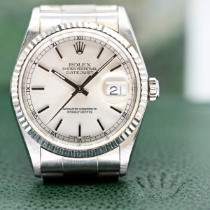 Herrenarmbanduhr, ROLEX, Oyster Perpetual, DATEJUST, 21. Jh.1.200,00 €Steel; total weight: approx. 104.9 g; automatic movement; no. 558B and 78360; silver-coloured dial with date display at 3 o’clock; baton indices and luminous hands; sapphire crystal with magnifying lens; folding safety clasp; diameter of the bezel: approx. 35 mm; original box and case with instruction manual; no original certificate present; no guarantee for movement and function.