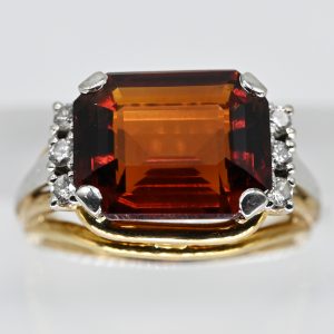 Ring mit Madeira Topas und 6 Brillanten, 60er Jahre380,00 €Stamped: 585/- yellow and white gold; total weight: approx. 6.5 g; high stepped ring head crafted from curved round wire with white gold elements and claws; centrally set elongated faceted Madeira topaz in a brownish yellow-golden colour variety; flanked on each side by 3 brilliant-cut diamonds, total approx. 0.06 ct; colour and clarity: upper range; dimensions of the ring centre: approx. 12 x 16.8 mm, height: approx. 8.2 mm; fan-shaped ring shank junction; ring size: 50; visible solder joint due to a ring size alteration.