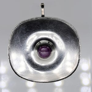 Brosche/Anhänger mit Sternrubin-Cabochon, Goldschmiedearbeit, 80er Jahre80,00 €Stamped: 925/- silver; total weight: approx. 18.3 g; stylised rectangular form with rounded corners and finely profiled edge; concave centre and central elevation set with a round star ruby cabochon; reddish-violet colour variety with pronounced asterism; diameter: approx. 8.5 mm; reverse with fold-down pendant loop and brooch pin fitting; unidentified monogram stamp on a small rectangular soldered plaque; overall dimensions: approx. 42.5 x 46.4 mm.