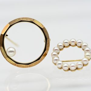 2 verschiedene Nadeln mit Perlen und unterschiedlichen Goldlegierungen, 1960er Jahre60,00 €1) Stamped: 585/- yellow gold; total weight: approx. 3.4 g; circular form with 15 applied cream-coloured Akoya pearls with silver-toned lustre; diameter: approx. 3.5 mm; overall diameter: approx. 20.8 mm;