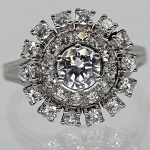 Cocktailring mit 27 Brillanten, zus. ca. 2 ct, 1980er Jahre1.800,00 €Stamped: 585/- white gold; total weight: approx. 6.7 g; individual, triple-stepped, rosette-arranged prong settings set with 27 brilliant-cut diamonds, total approx. 2 ct; detailed: central brilliant approx. 0.7(2) ct; colour: G-H; clarity: VSI; broad girdle with natural; inner circle with 12 set brilliant-cut diamonds, total approx. 0.3(7) ct; colour and clarity: in the upper range; outer circle with 14 set brilliant-cut diamonds, total approx. 0.9(1) ct; colour and clarity: in the upper range; one small chip at the girdle; dimensions of the ring head: diameter: 16.5 mm, height: approx. 8.2 mm; ring size: 56.5.