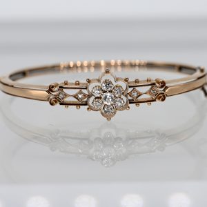 Armreif mit 11 Altschliff-Diamanten, zus. ca. 0,7 ct, um 19001.200,00 €Stamped: 585/- rose gold, unidentified gold mark on the reverse of the snap clasp; total weight: approx. 14.9 g; hinged oval, triple-profiled along the contour; centrally pierced ornamental decoration in filigree style and stylised rosette form; fine lateral granulation; centrally set seven stepped prong settings, each set with an old-cut diamond, total approx. 0.7 ct; colour: G-H; clarity: VSI-SI; on each shoulder two small lozenge-shaped settings, each set with a rose-cut diamond; concealed box clasp with lateral safety chain; dimensions of the bangle centre: approx. 14.9 x 35 mm; inner bangle dimensions: approx. 5.6 x 4.8 cm.