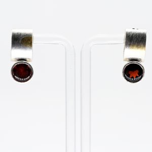 Paar Ohrstecker mit hochfeinem Granat, Goldschmiedearbeit, N. M., 21. Jh.320,00 €Stamped: 925/- silver and yellow gold; total weight: approx. 9.39 g; elongated, two-part rectangular form with satin-finished surface decoration and a geometric pattern worked in yellow gold; upper section in open semi-arched form with an applied transverse oval bezel setting set with a garnet; intense red colour variety; total length: approx. 24.8 mm; width: approx. 9.9 mm.