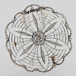 Edwardianische Filigranbrosche in Blütenform mit Altschliffdiamanten und Orientperlen, Goldschmiedearbeit, um 1910900,00 €Unmarked: probably platinum; total weight: approx. 8.7 g; 12-lobed floral design with filigree wire elements, milgrain detailing and corded border decoration; centrally set old-cut diamond approx. 1 ct, clarity: SI2-P1, colour: G-H; six elliptical cartouches radiating from the centre, each set with five diamond roses, total approx. 0.22 ct, colour: middle range, clarity: all ranges; six evenly spaced silver-grey oriental pearls with slightly dull silvery lustre, diameter: approx. 2.7 mm; sliding hook with double pin stem; diameter: approx. 39 mm; height: approx. 11 mm.