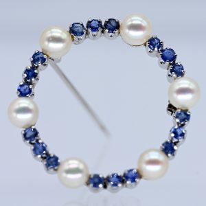 Perlkranzbrosche mit Saphiren und Perlen, Goldschmiedearbeit, 1980er Jahre120,00 €Stamped: 750/- white gold; total weight: approx. 5.8 g; wreath design with a total of 18 round faceted sapphires in cornflower-blue colour variety, each set in four-prong settings, arranged in groups of three side by side, separated by six cream-coloured Akoya pearls with fine rosé lustre, pearl surfaces showing slight natural characteristics (one with circular nacre loss), diameter: approx. 5.4 mm; ball hook clasp; unidentified monogram stamp; diameter of the brooch: approx. 31.9 mm.