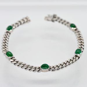 Massives Flachpanzerarmband mit 5 Smaragd-Cabochons, zus. ca. 5,1 ct, Juwelier Wilkens, Hamburg, 19932.400,00 €Stamped: 750/- white gold; total weight: approx. 27.3 g; flat curb-link chain pattern with concealed box clasp and lateral safety catches; 5 regularly set emerald cabochons, total approx. 5.1(4) ct, transverse oval bezel settings; each set with an emerald; intense green colour variety with visible jardin; dimensions per stone: approx. 7 x 5 mm; dimensions per setting: approx. 8.1 x 6.2 mm; total length: approx. 19 cm; purchase receipt from M.H. Wilkens & Söhne, Hamburg, Germany, dated 1993.