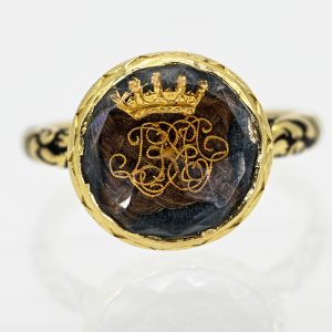 Antiker Erinnerungsring mit Monogramm und Krone, um 1800680,00 €Unmarked: 585/- yellow gold; total weight: approx. 4.4 g; round ring head in stylised basket form; on the surrounding outer wall vertical linear black enamel contours; narrow serrated engraved bezel edge; centrally set braided hair in the base; applied gold-coloured five-pointed crown with underlying alloyed monogram made of finely curved cord wire; covered by a faceted colourless glass cabochon; ornament decoration on the ring shoulder contoured with black enamel; diameter of the ring centre: approx. 12.9 mm; height: approx. 5.3 mm; ring size: 55; glass facets with age-related signs of wear.
