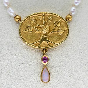 Collier mit Biwaperlen, Opaltropfen und rosafarbenem Turmalin, Goldschmiedearbeit, 21. Jh.220,00 €Stamped: 750/- yellow gold; hook clasp, centrally placed relief-decorated transversely oval plaque with tree and bird motif; suspending a set pink tourmaline cabochon and a drop-shaped opal cabochon in milk opal variety; small ovoid-shaped strands of Biwa pearls; dimensions of the central element: approx. 15.6 x 21.3 mm, length: approx. 30 mm; overall length: 38.5 cm.