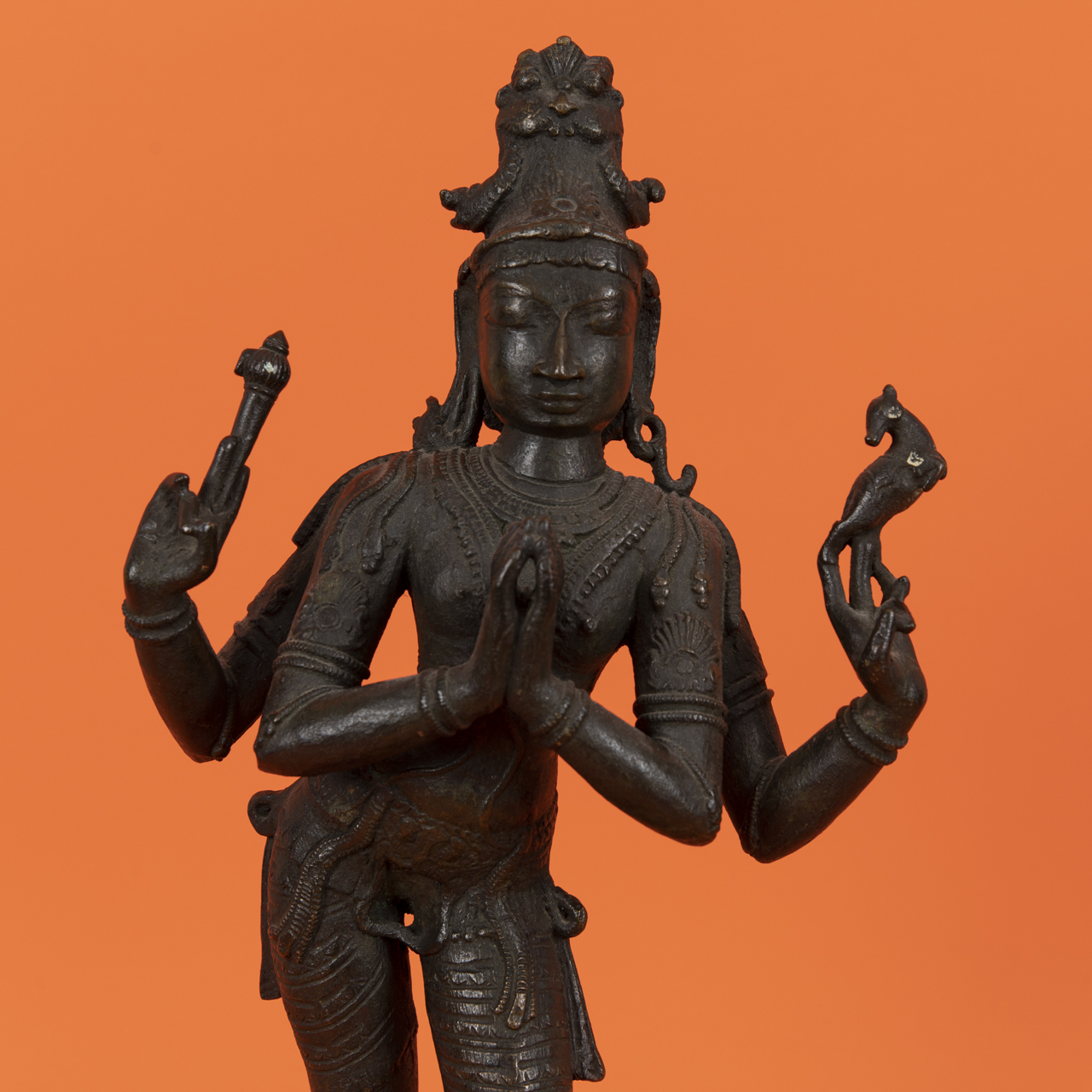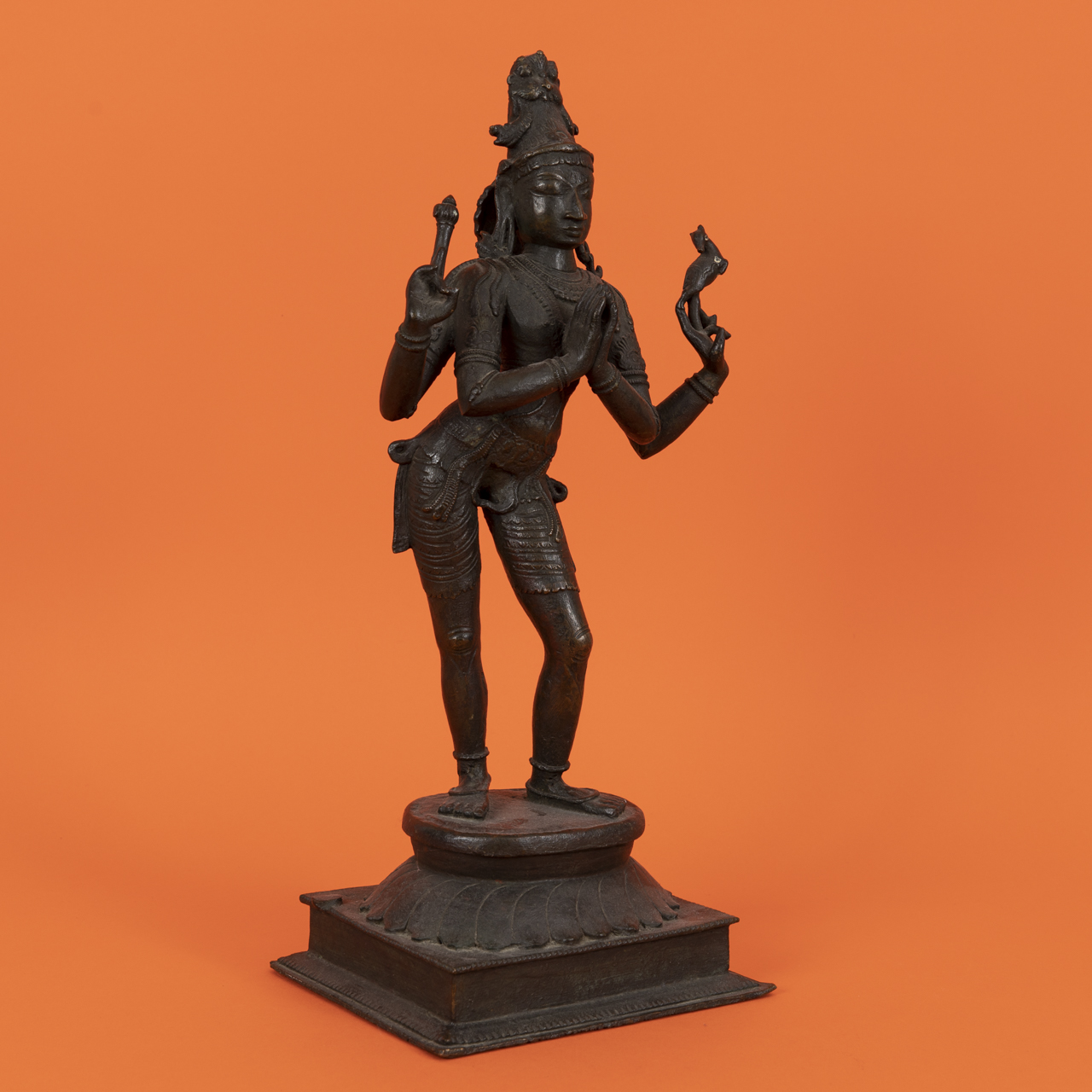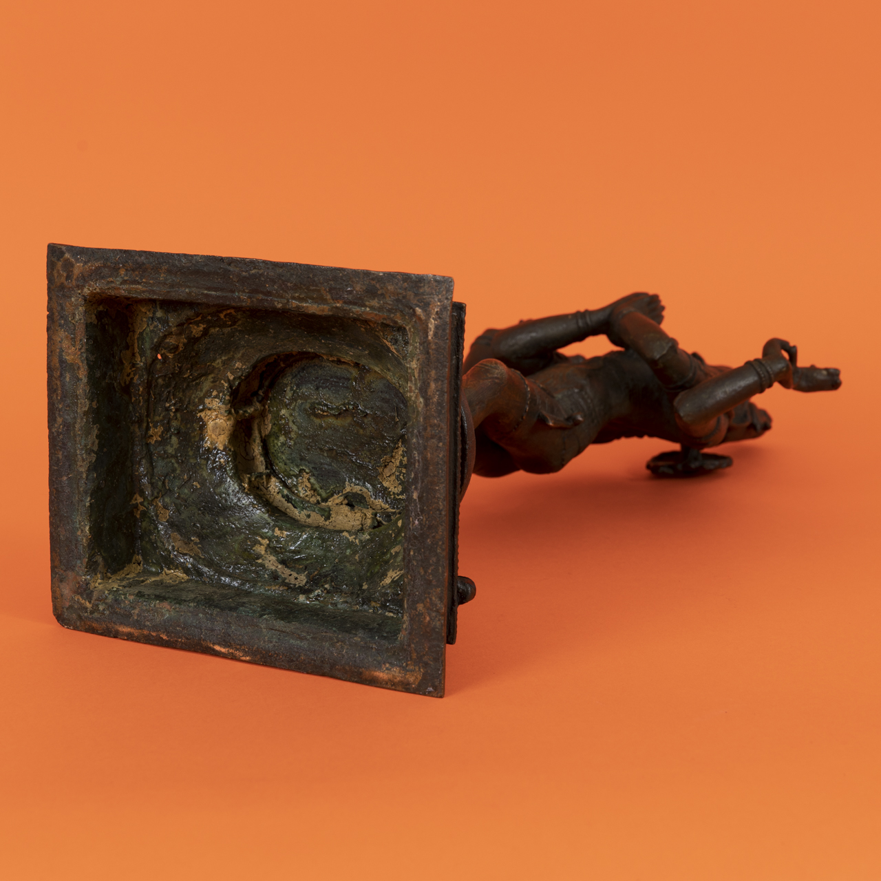 Dark-patinated bronze; on a stepped rectangular plinth, the four-armed figure stands in a dancing pose on a raised oval lotus base, with two hands in “Anjali Mudra” gesture; height: approx. 43.5 cm; weight: approx. 7 kg.
