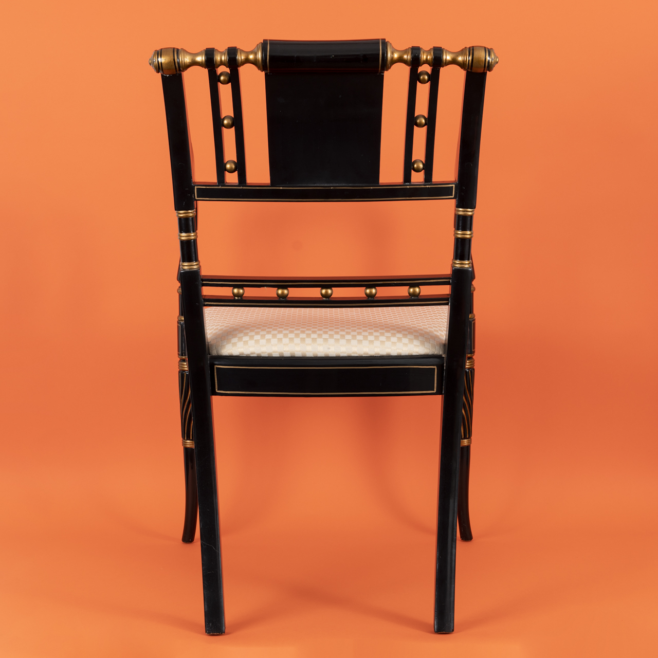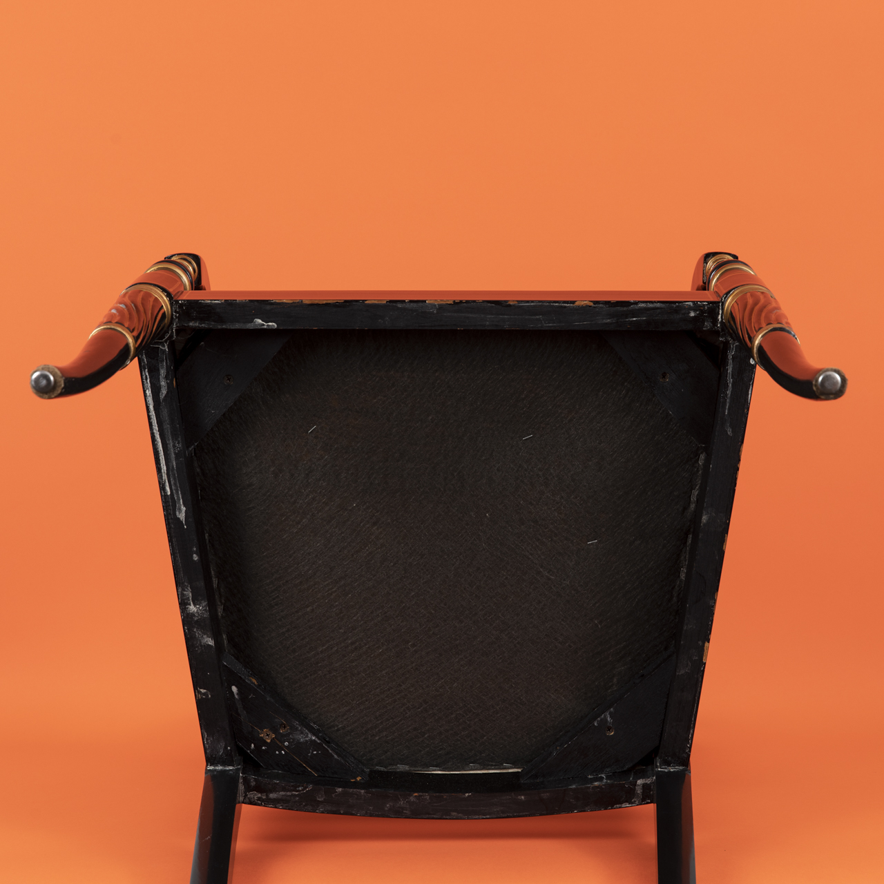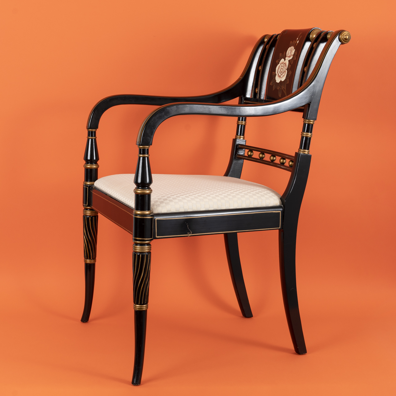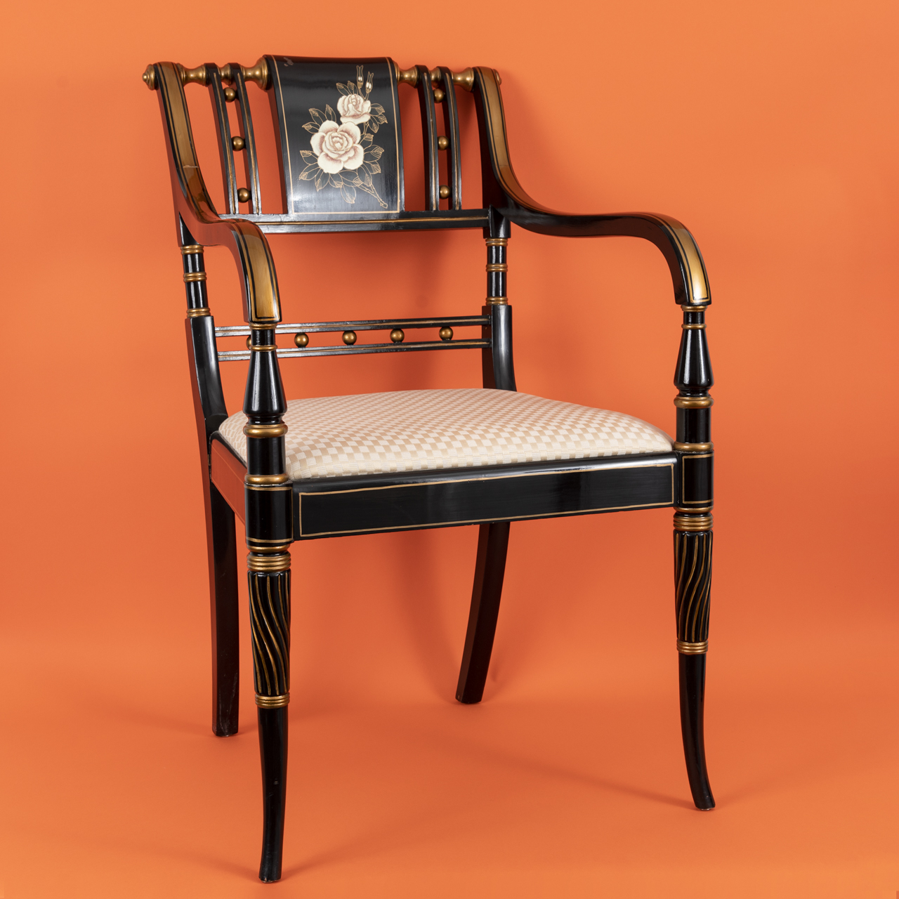 Neuzeitlicher Armlehnstuhl in Schwarzlack; Rückenschild mit floraler Bemalung; Verstrebungen und Armlehnen goldkonturiert; Höhe der Rückenlehne: ca. 90 cm; Maße der Sitzfläche: 50 x 54 cm.