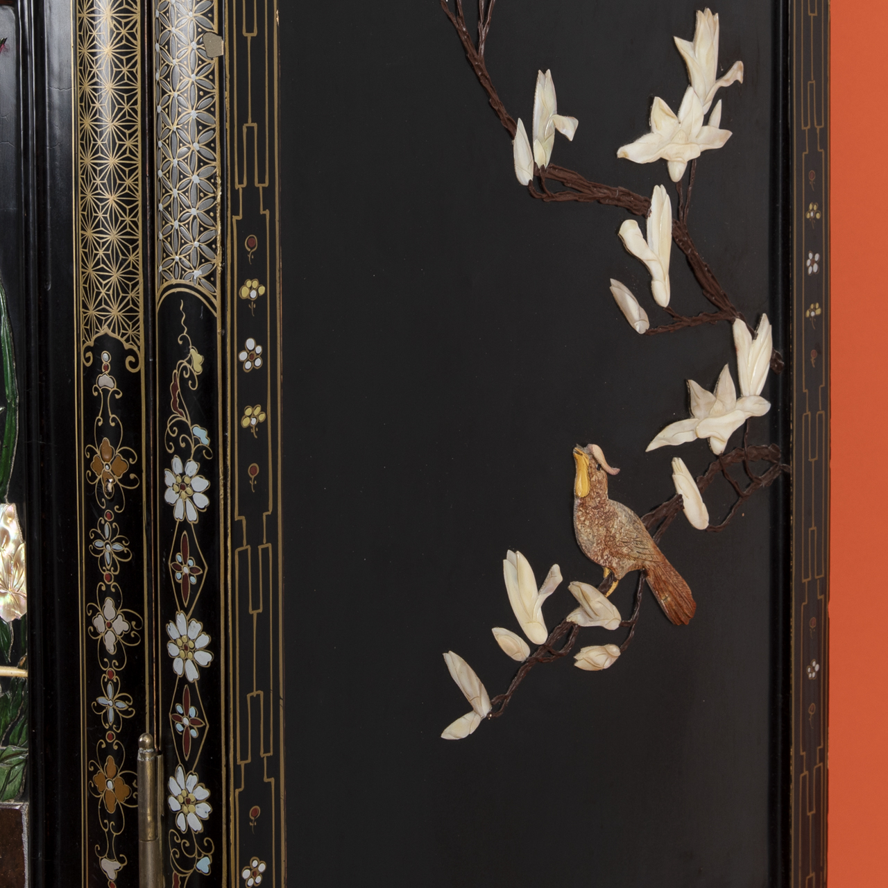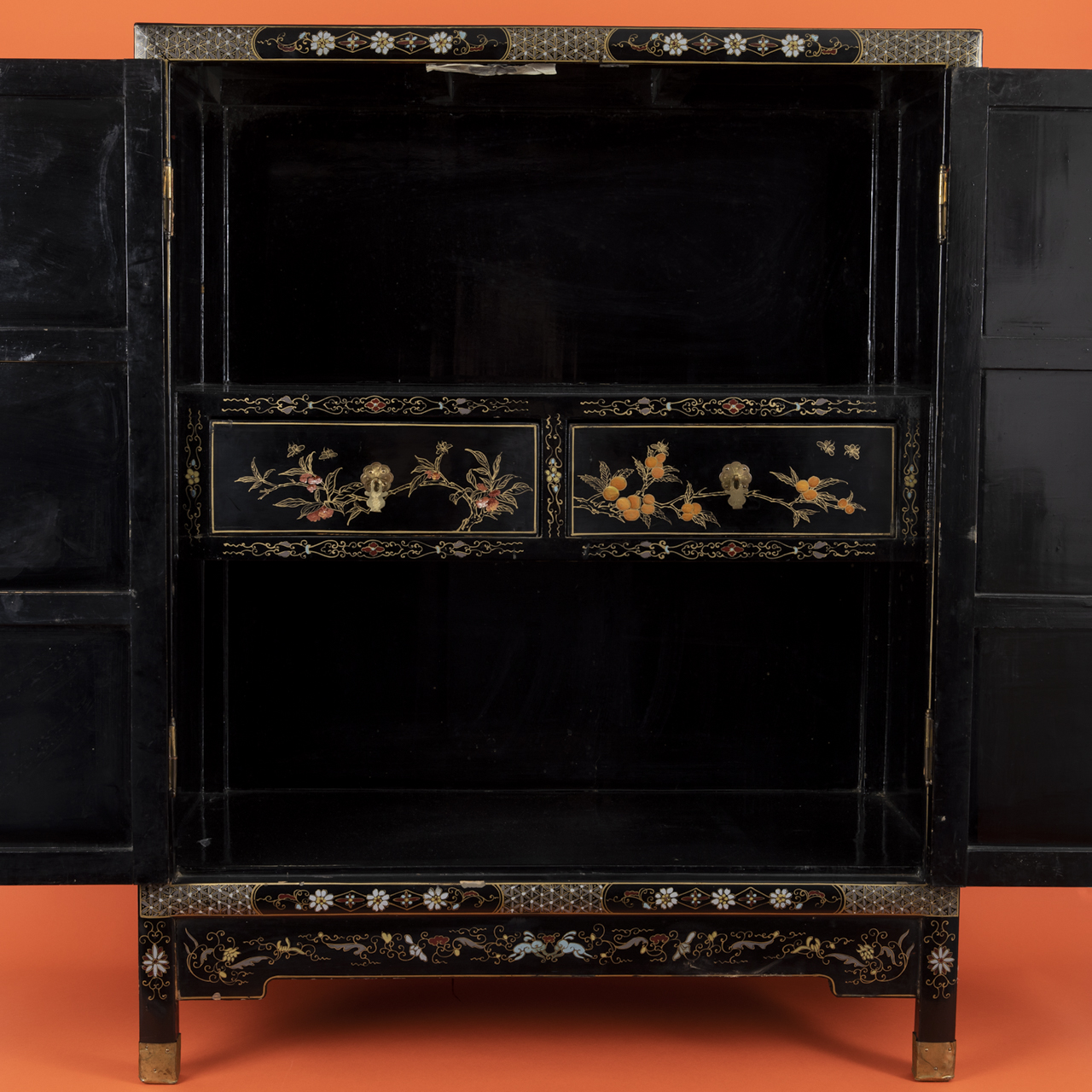 Rectangular body on four legs with stretcher; two doors; black lacquer with surrounding polychrome floral and animal décor in painting and applied mother-of-pearl and coloured soapstone; brass fittings; interior division with two drawers and two shelves; drawer fronts with polychrome and gilt floral painting; brass knobs; dimensions: 107 x 84 x 40 cm; various small restorations, losses and age-related chips.
