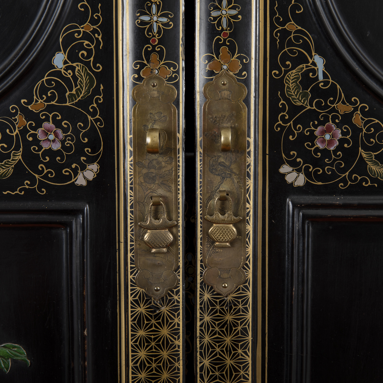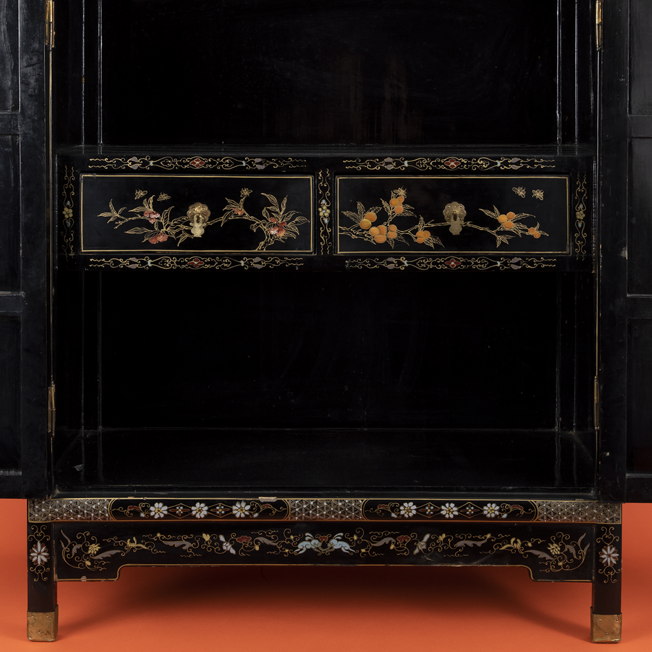 Rechteckiger Korpus auf vier Füßen mit Verstrebung; zweitürig; Schwarzlack mit umlaufendem polychromem Floral- und Tierdekor in Malerei sowie appliziertem Perlmutt und eingefärbtem Speckstein; Messingbeschläge; Inneneinteilung mit zwei Schubladen und zwei Böden; Schubladenfronten mit polychromer und goldfarbener Floralbemalung; Messingknäufe; Maße: 107 x 84 x 40 cm; diverse kleine Restaurierungen, Fehlstellen und altersbedingte Bestoßungen.