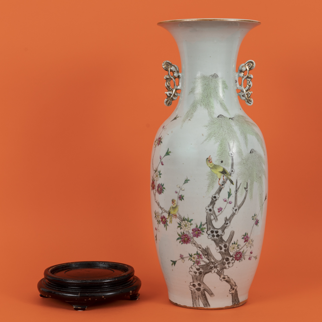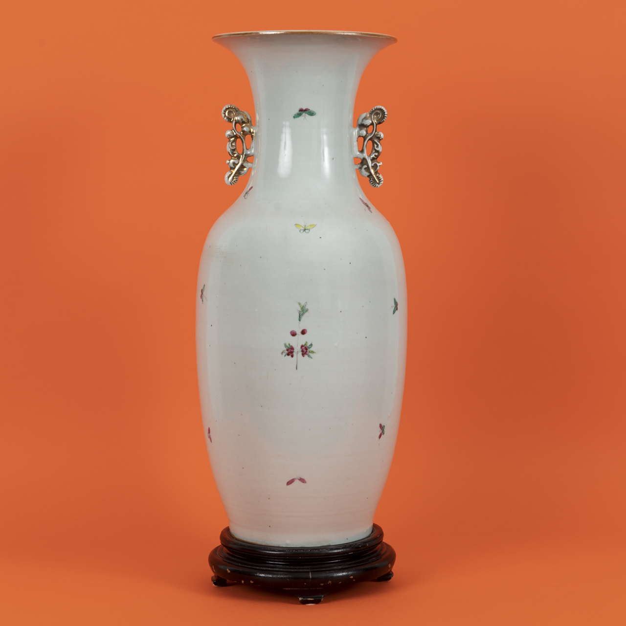 White porcelain; on the front, polychrome floral and bird décor; on the reverse, small polychrome butterflies; slender baluster form with short neck and flared mouth rim; on the shoulder two applied openwork ornamental handles; height: approx. 57.5 cm; mouth rim diameter: approx. 21 cm; remains of an old red sealing wax mark on the base; wooden stand not belonging. Shipping exclusively by forwarding agent or at the buyer’s risk.
