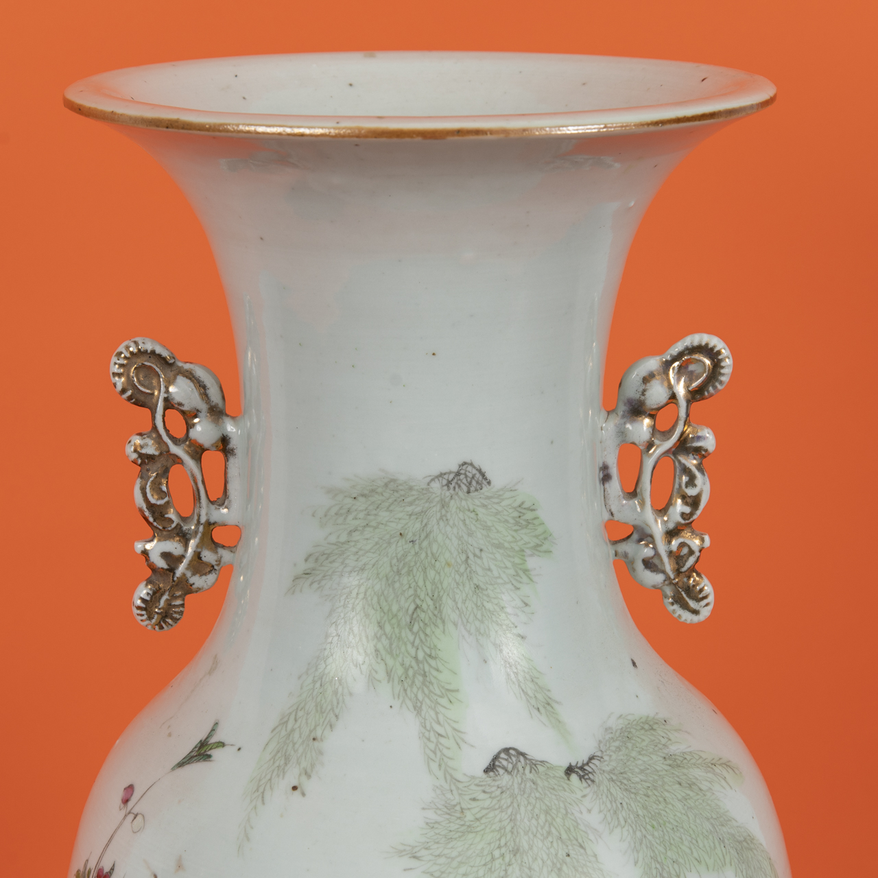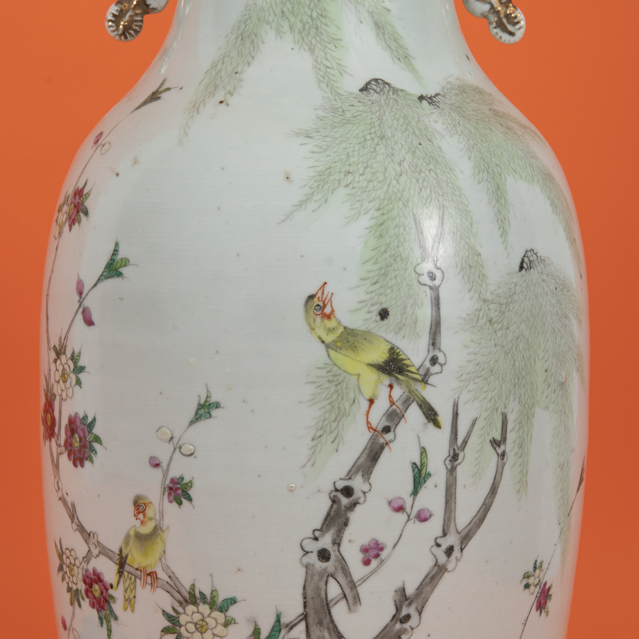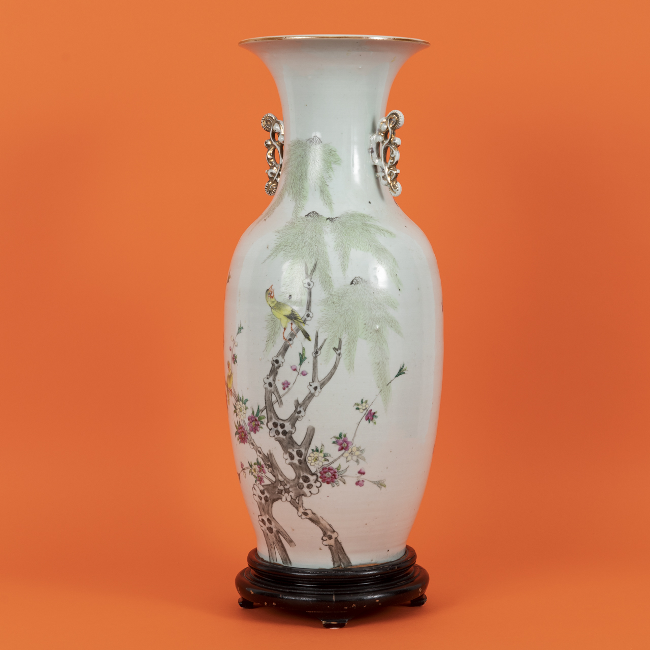 Weißporzellan; auf der Schauseite polychromer Blumen- und Vogeldekor; rückseitig kleine polychrome Schmetterlinge; schlanke Balusterform mit kurzem Hals und ausgestelltem Öffnungsrand; auf der Schulter zwei angesetzte, durchbrochene Ornamenthandhaben; Höhe: ca. 57,5 cm; Durchmesser des Öffnungsrandes: ca. 21 cm; im Boden Reste eines alten roten Siegellackstempels; Holzsockel nicht dazugehörig. Versand ausschließlich per Spedition oder auf Risiko des Käufers.