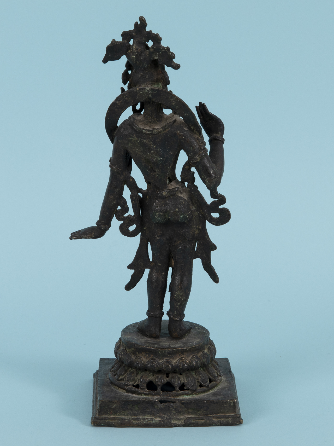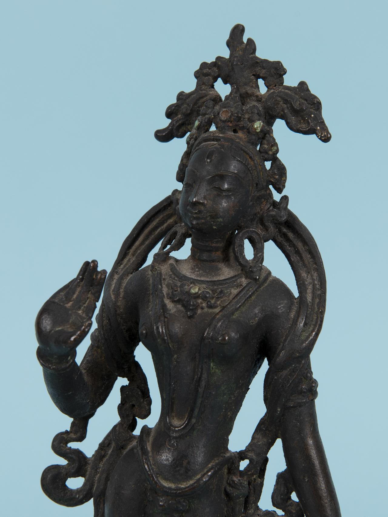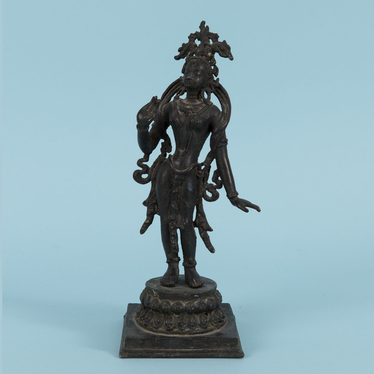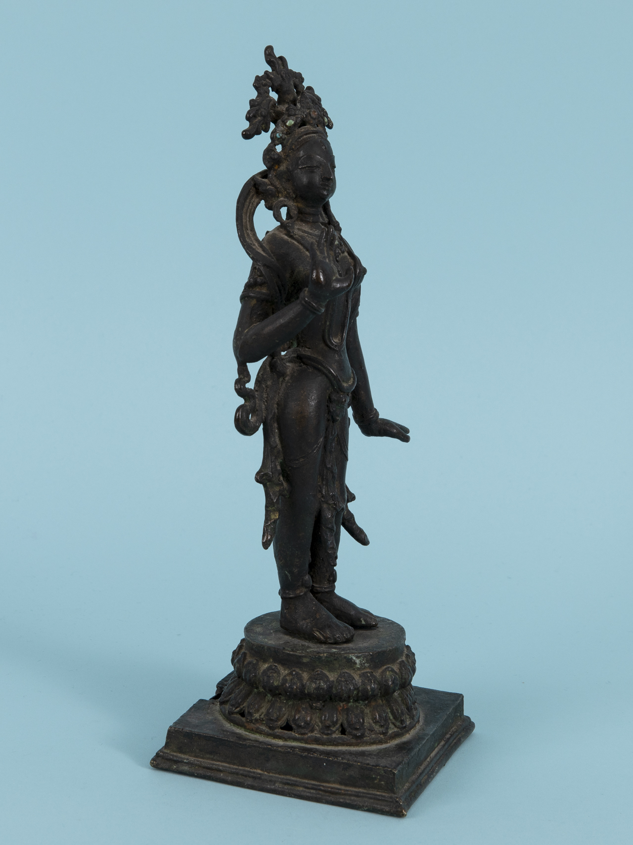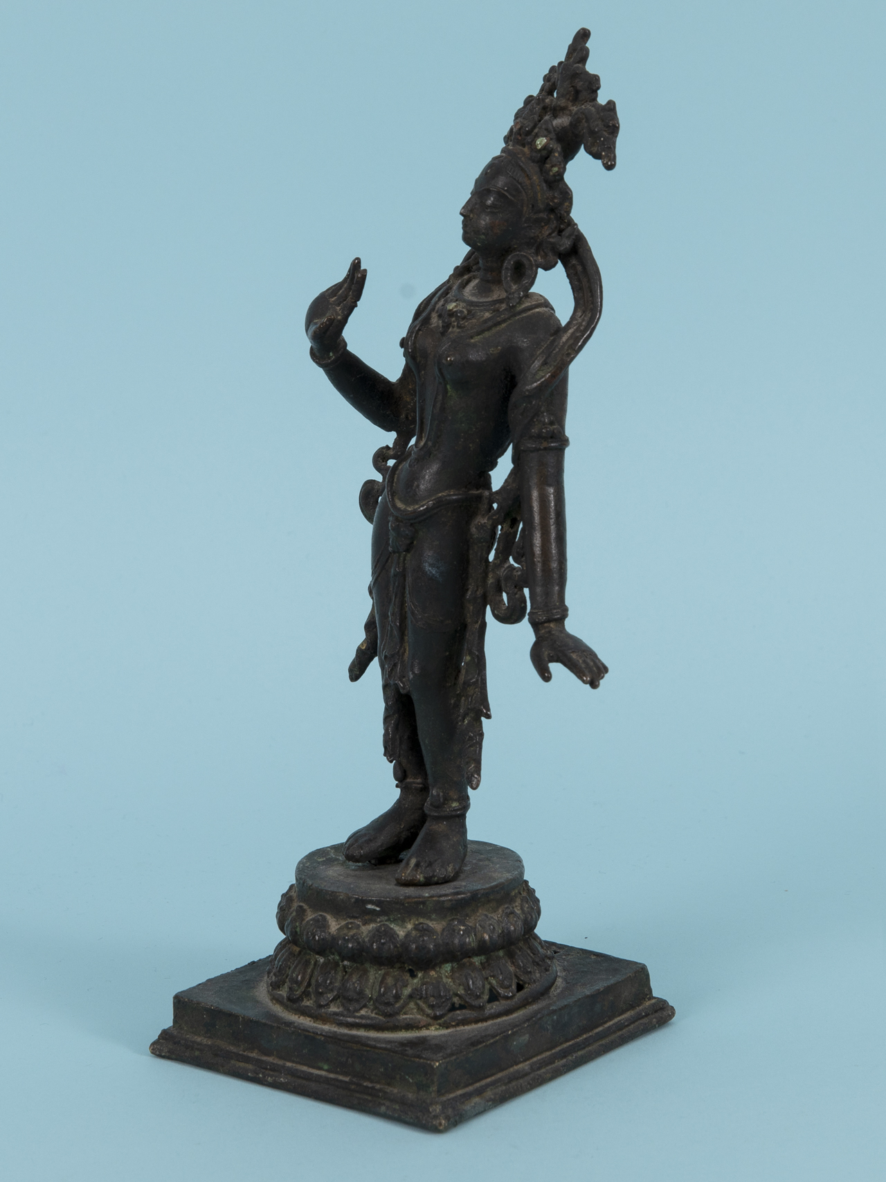 Bronze with dark age-related patina and remains of small coloured stone appliqués; worked in two parts in the form of a standing figure and a base (square stepped base with raised circular plinth); finely proportioned and richly detailed frontal depiction of a female deity, with small dot-like coloured stone cabochon inserts on the head and neck ornaments respectively (1 x missing, 1 x damaged), verso worked in a simplified, flattened manner; beneath the feet two square-section rods (probably later additions) for plug-in mounting into the base; base verso with losses; age-related signs of wear; overall height: 25 cm; weight: approx. 1.26 kg.