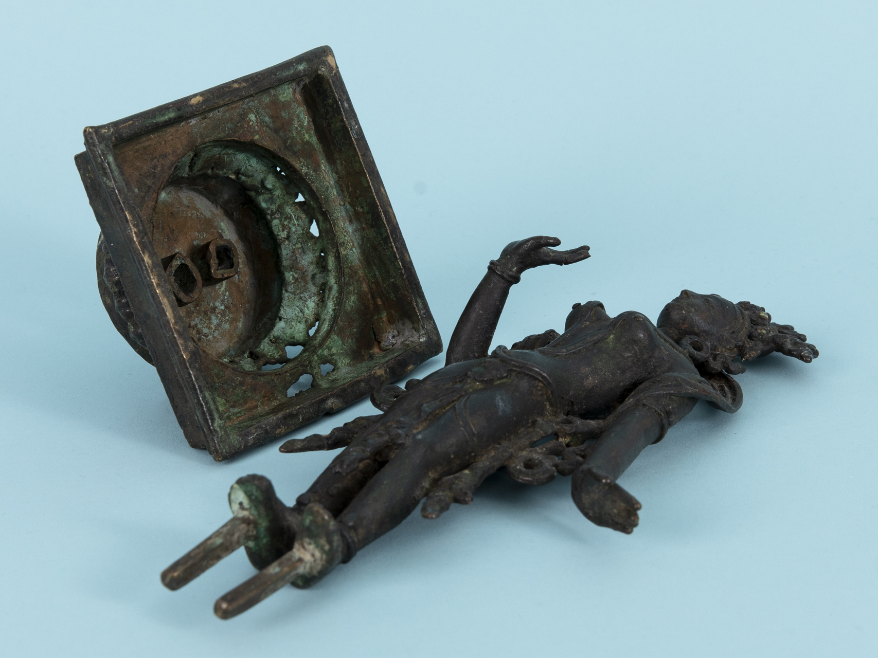 Bronze mit dunkler Alterspatina und Resten kleiner farbiger Steinapplikationen; 2-teilig gearbeitet in Form einer Standfigur und eines Sockels (quadratische gestufte Basis mit erhöhtem Rundsockel); frontal feingliedrig und detailreich gearbeitete Standfigur einer weiblichen Gottheit, auf dem Kopf- und Halsschmuck jeweils mit kleinen punktartigen farbigen Steincabochon-Einsätzen (1 x fehlend, 1 x defekt), verso vereinfacht abgeflacht gearbeitet; unter den Füßen 2 Vierkantstäbe (wohl später ergänzt) zur Steck-Montierung in den Sockel; Sockel verso mit Fehlstellen; Altersspuren; Gesamthöhe: 25 cm; Gewicht: ca. 1,26 kg.