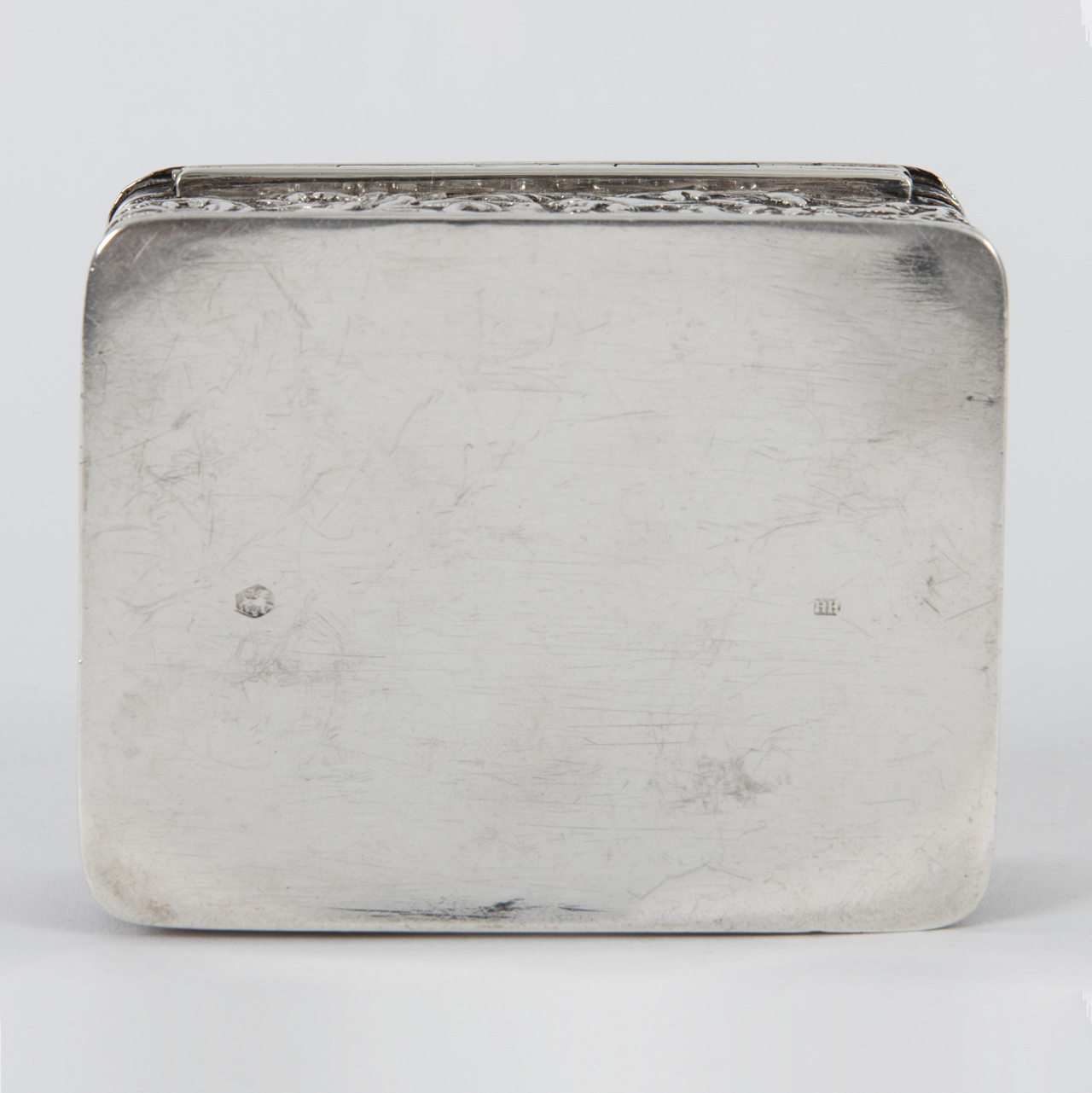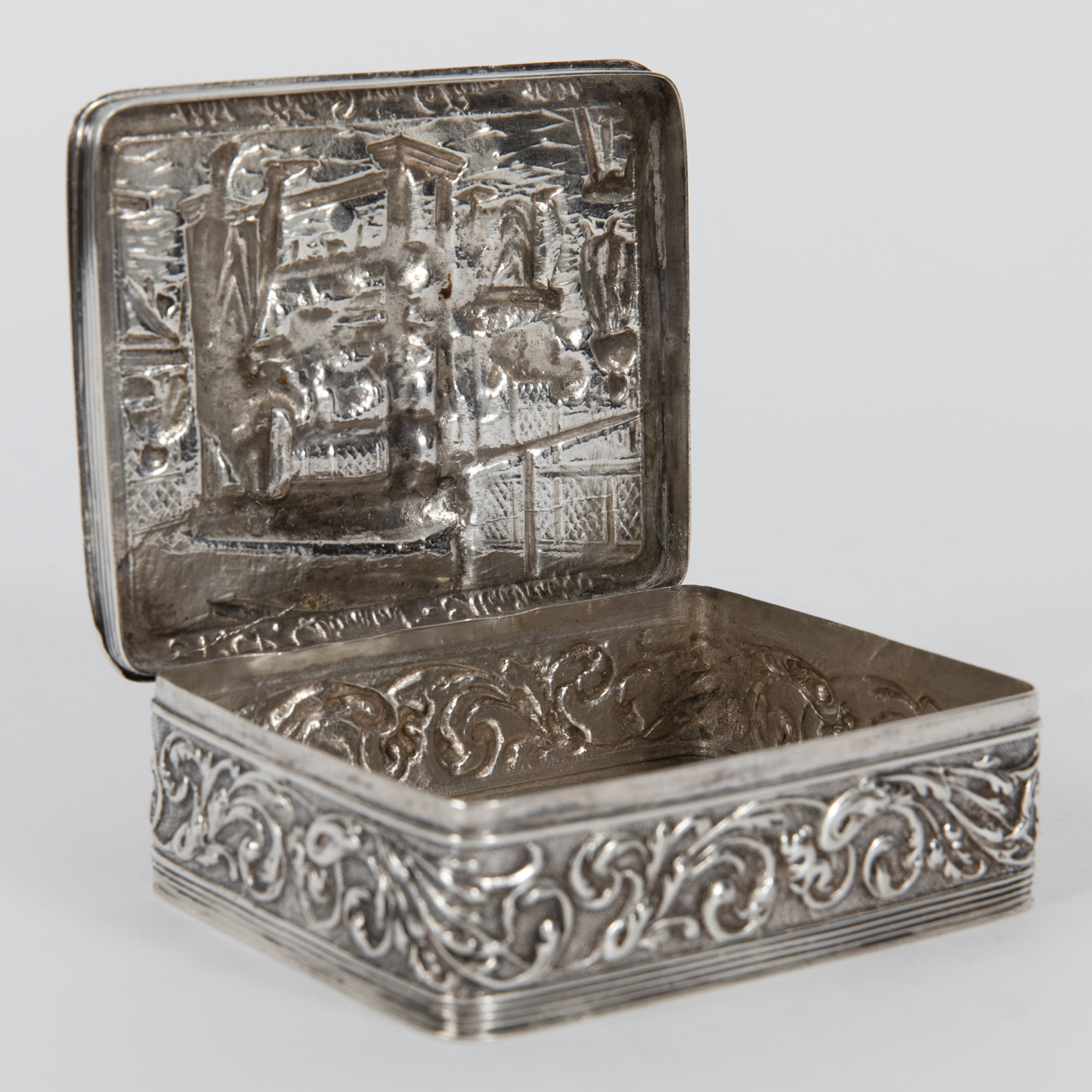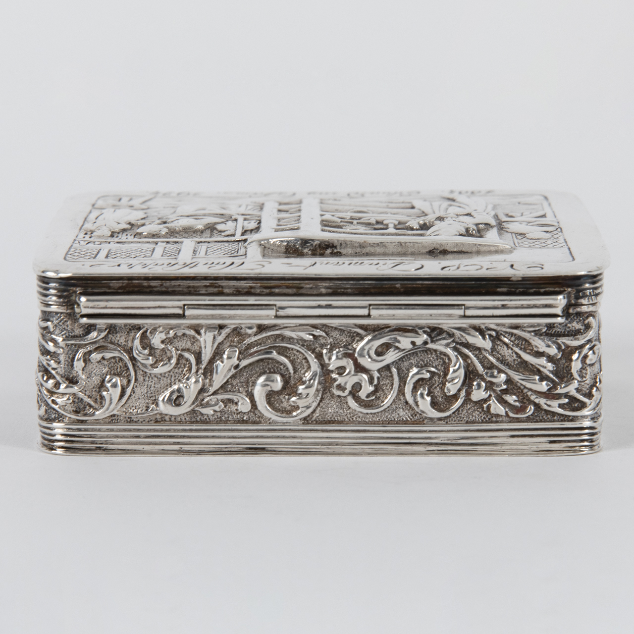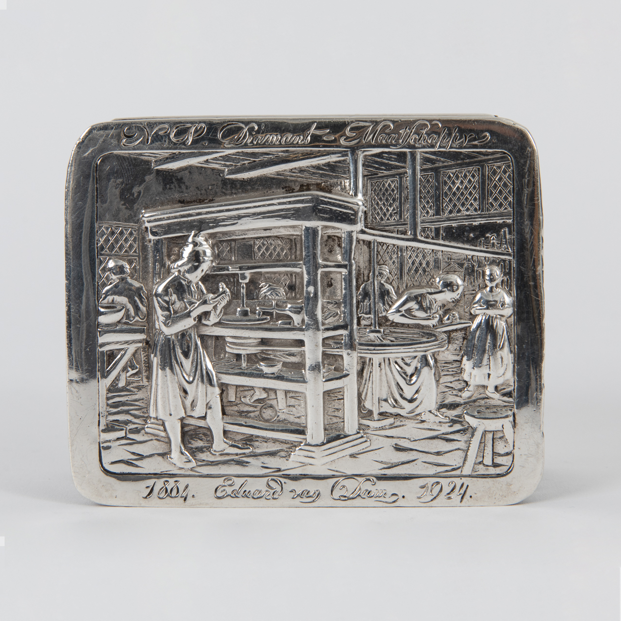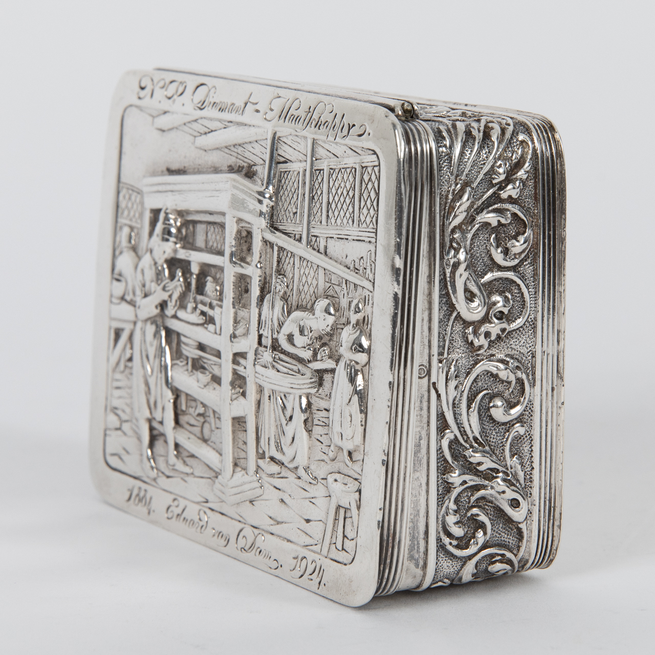 833/- Silber; Gesamtgewicht: ca. 106 g; Dose in gerundet rechteckiger Form mit umlaufender Bordüre mit Mauresken auf der Wandung und abklappbarem Deckel mit Abbildung eines Interieurs einer Diamantschleiferei mit Personenstaffage und Gravur „N. V. Diamant-Maatschappy 1884. Eduard van Dam. 1924“; gestempelt mit niederländischer Silbergarantiemarke (schreitender Löwe mit Zahl 2) und Meistermarke auf dem Boden, Jahresbuchstabe auf der Innenfalz sowie Beschaumarke mit Buchstaben M auf dem Deckel; altersbedingte Gebrauchsspuren; Maße: ca. 8,5 x 6,7 cm.
