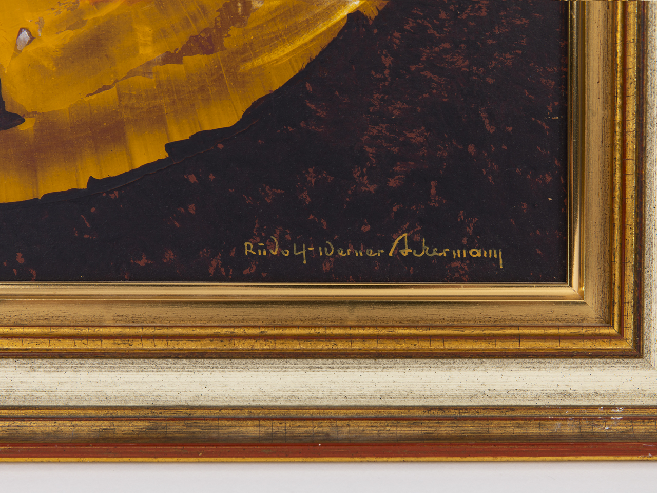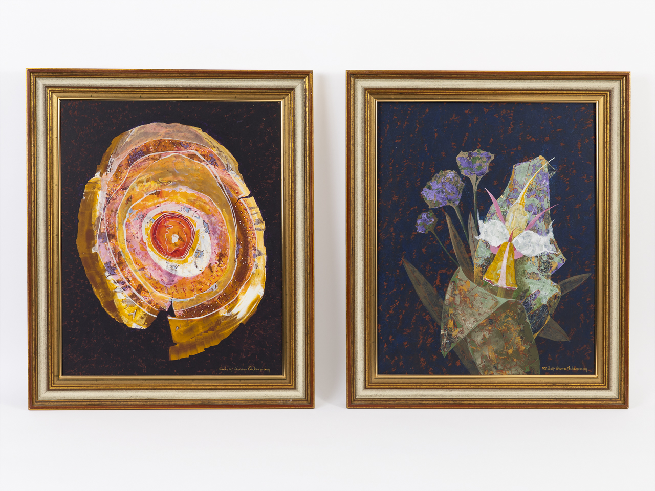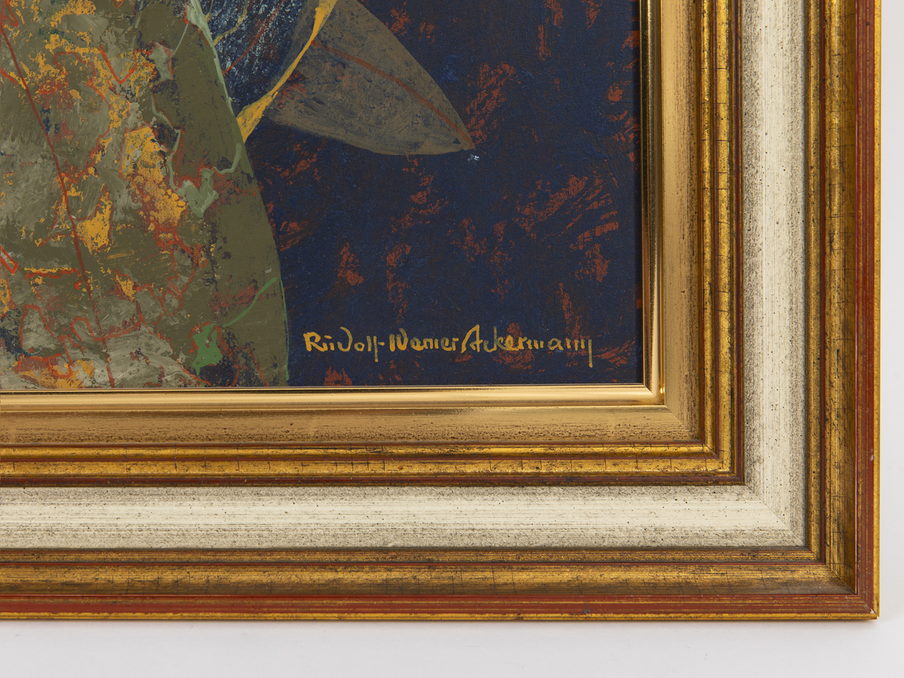 Öl/Acryl auf Malkarton; zwei abstrakt-naturalistische Gemälde: 1) ovale konzentrische Farbkomposition in Gelb-, Orange- und Pink-Variationen mit Weiß und Grau vor dunklem Hintergrund. 2) abstrahiert stilisierte Stilllebenkomposition mit Blüten- und Blattwerk vor dunklem Hintergrund; rückseitig betitelt "Prachtorchidee". Beide mit altersbedingten Gebrauchsspuren; unten rechts signiert; geschwungener gold-changierender Rahmen; Bildmaße: je ca. 49 x 39 cm; Rahmenmaße: je ca. 60 x 50 cm; Gesamtgewicht: ca. 3,4 kg.