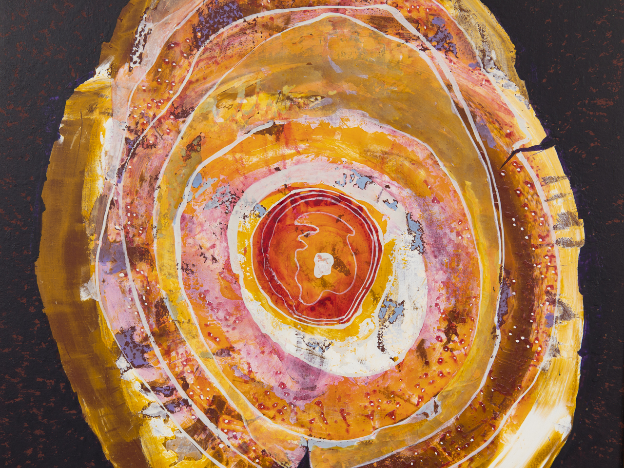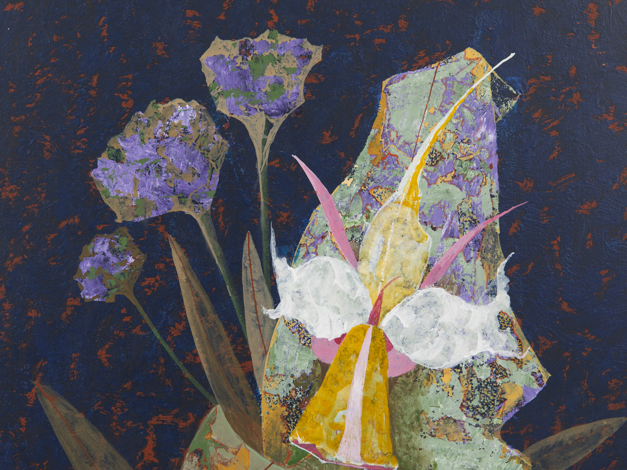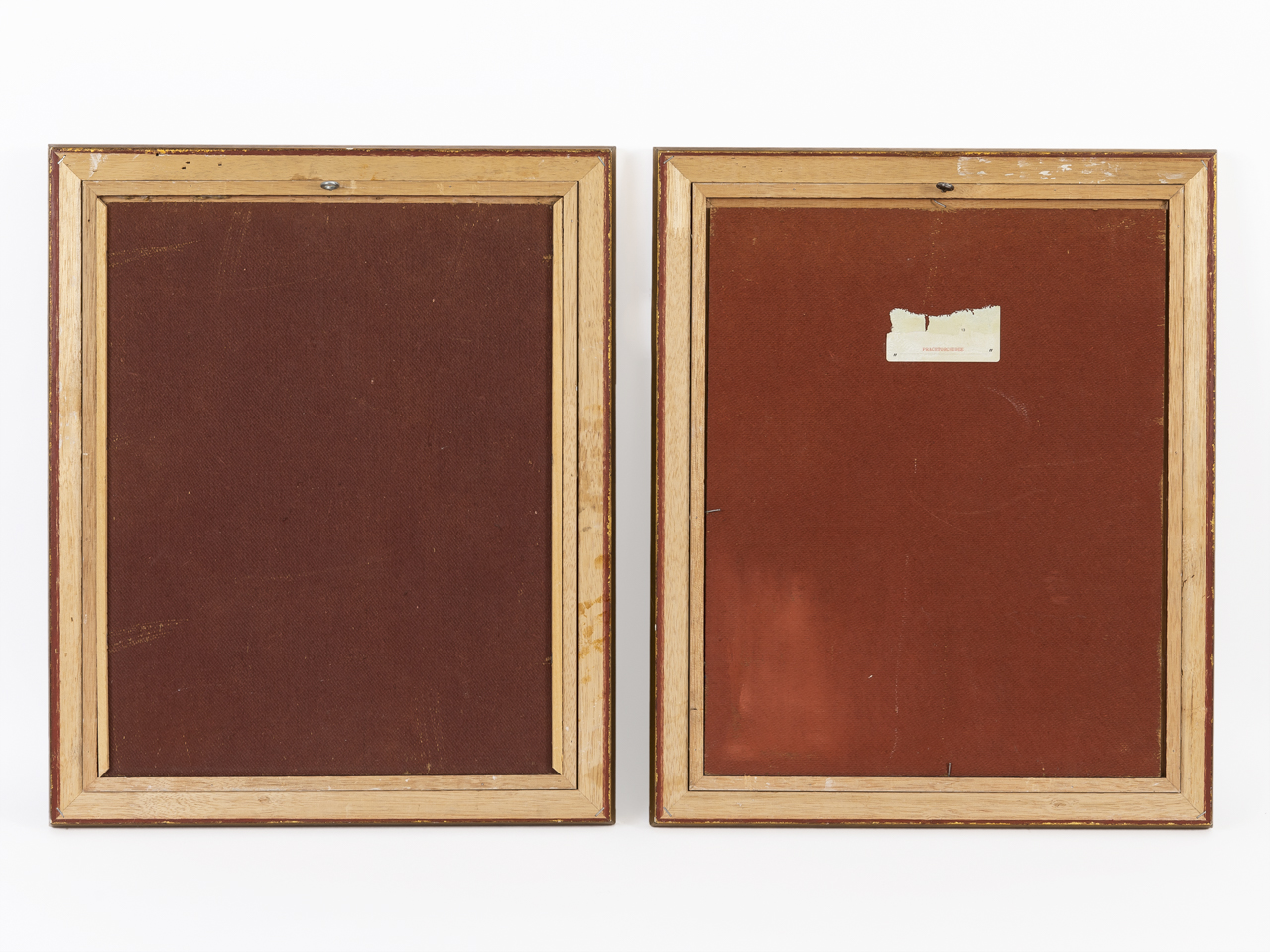 Öl/Acryl auf Malkarton; zwei abstrakt-naturalistische Gemälde: 1) ovale konzentrische Farbkomposition in Gelb-, Orange- und Pink-Variationen mit Weiß und Grau vor dunklem Hintergrund. 2) abstrahiert stilisierte Stilllebenkomposition mit Blüten- und Blattwerk vor dunklem Hintergrund; rückseitig betitelt "Prachtorchidee". Beide mit altersbedingten Gebrauchsspuren; unten rechts signiert; geschwungener gold-changierender Rahmen; Bildmaße: je ca. 49 x 39 cm; Rahmenmaße: je ca. 60 x 50 cm; Gesamtgewicht: ca. 3,4 kg.