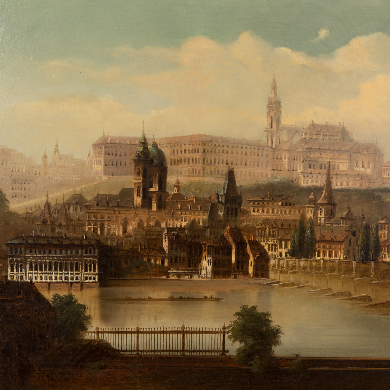 Oil on canvas, relined; neoclassical landscape painting; panoramic view of the city of Prague with the Vltava River in the foreground, beside it the Charles Bridge merging into a row of houses in front of a large castle complex on a hill under a cloudy sky in the background; signed lower left, inscribed “Vienna” and dated 1873(?); age-related surface discolourations, restoration traces of approx. 1 cm, and fine craquelure; gilded elaborately carved wooden frame with defects; not opened; painting dimensions: approx. 52.5 x 100 cm; frame dimensions: approx. 67.5 x 115 cm; weight: approx. 5.3 kg.