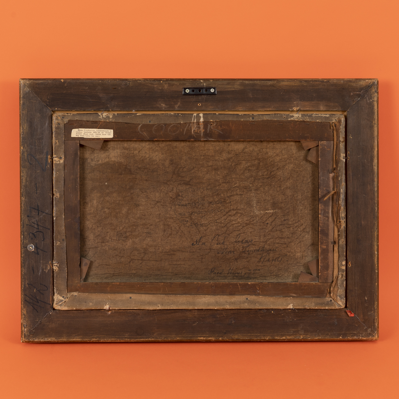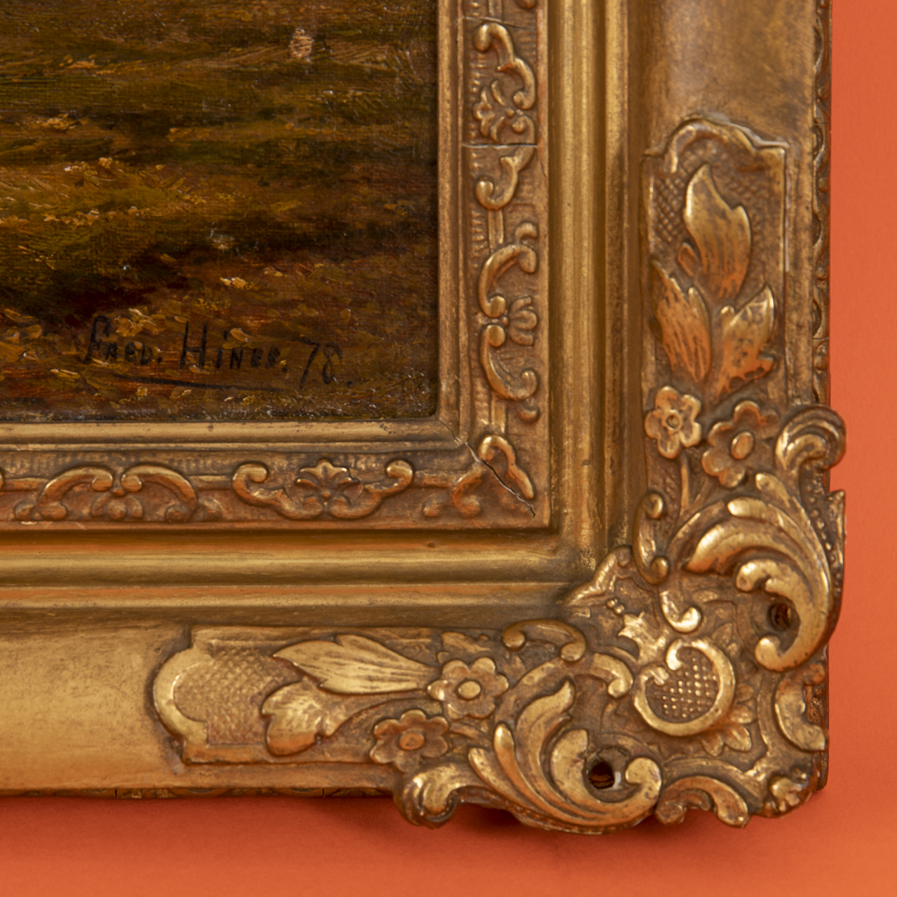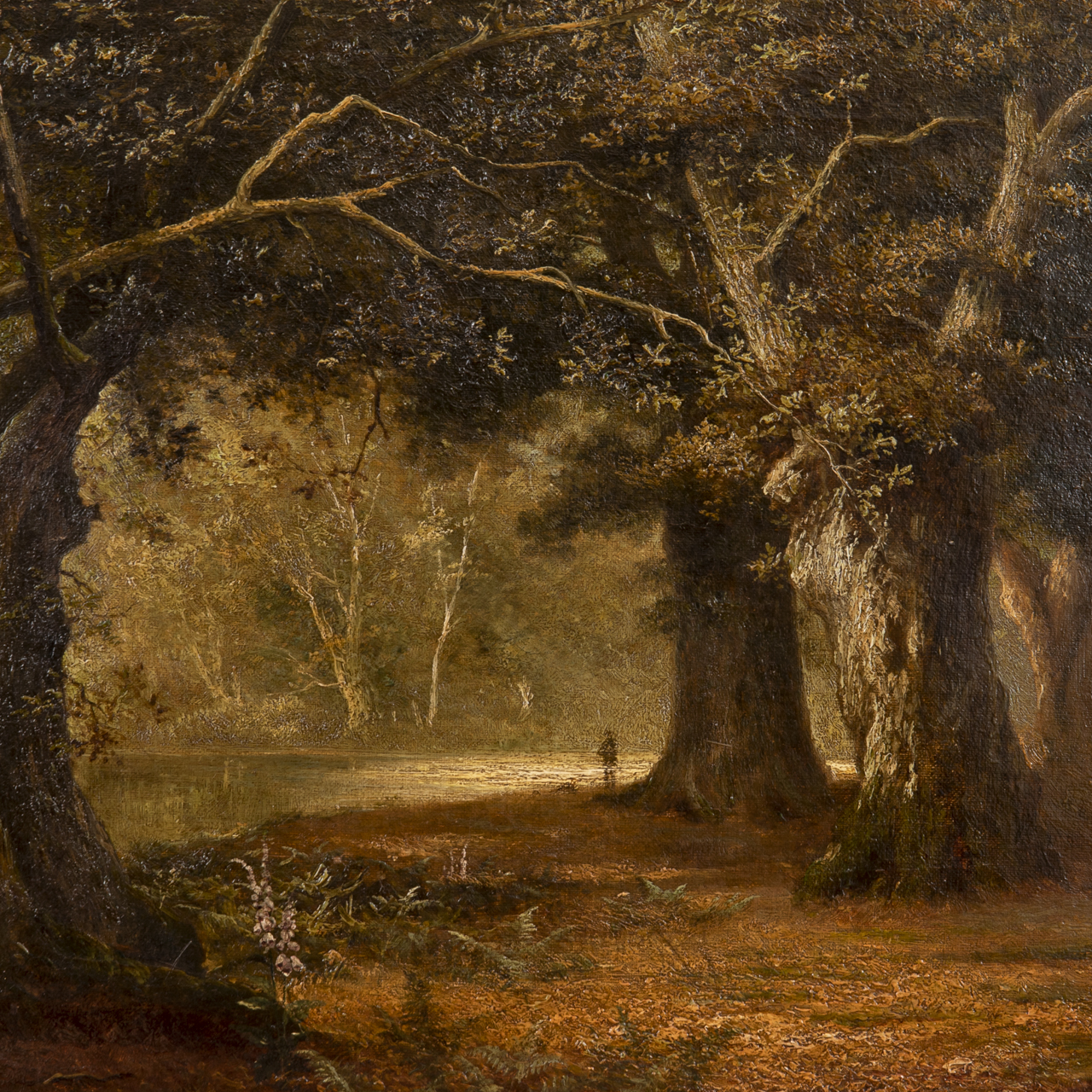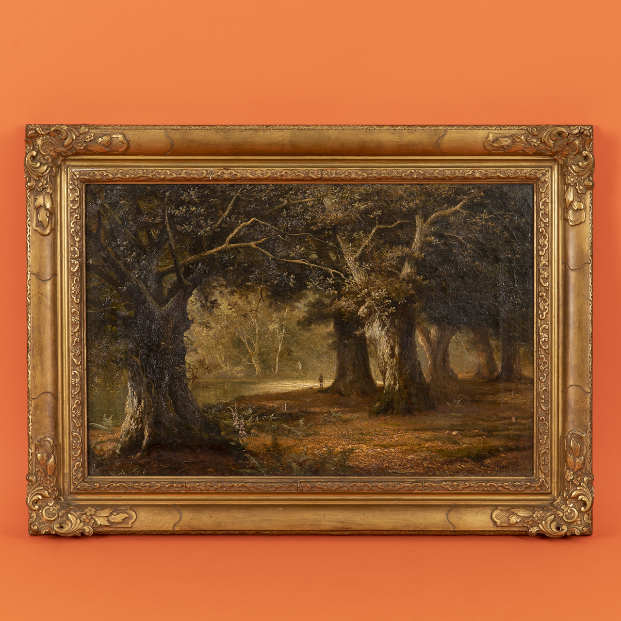 Öl auf Leinwand; Landschaftsmalerei in gedeckten Lokalfarben; Abbildung eines Waldsees, an dessen Ufer die Silhouette eines Menschen erkennbar ist, umrahmt von diversen Bäumen und Sträuchern sowie einzelnen Blumen im Vordergrund; unten rechts signiert und datiert (18)87; rückseitig auf der Leinwand verblichener Schriftzug und Stempel sowie zwei Klebeetiketten und Nummerierung am Rahmen; altersbedingte Oberflächenvergilbung; goldfarbener, getreppter Holzrahmen mit umlaufendem Floraldekor; nicht geöffnet; Bildmaße: ca. 35,5 x 53,5 cm; Rahmenmaße: ca. 48 x 66 cm; Gewicht: ca. 2,2 kg.