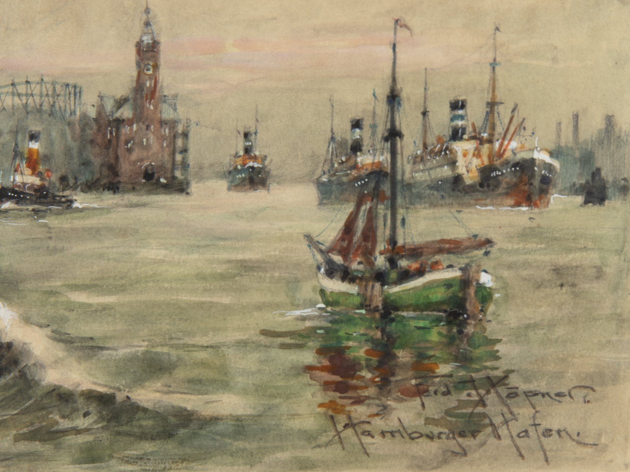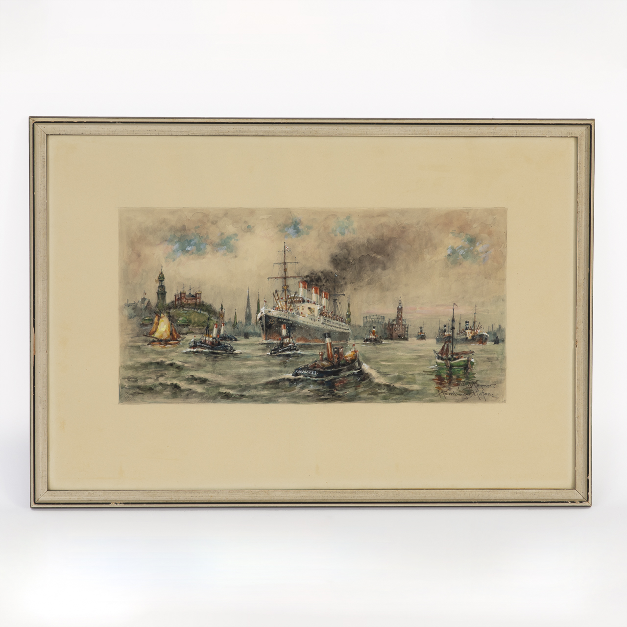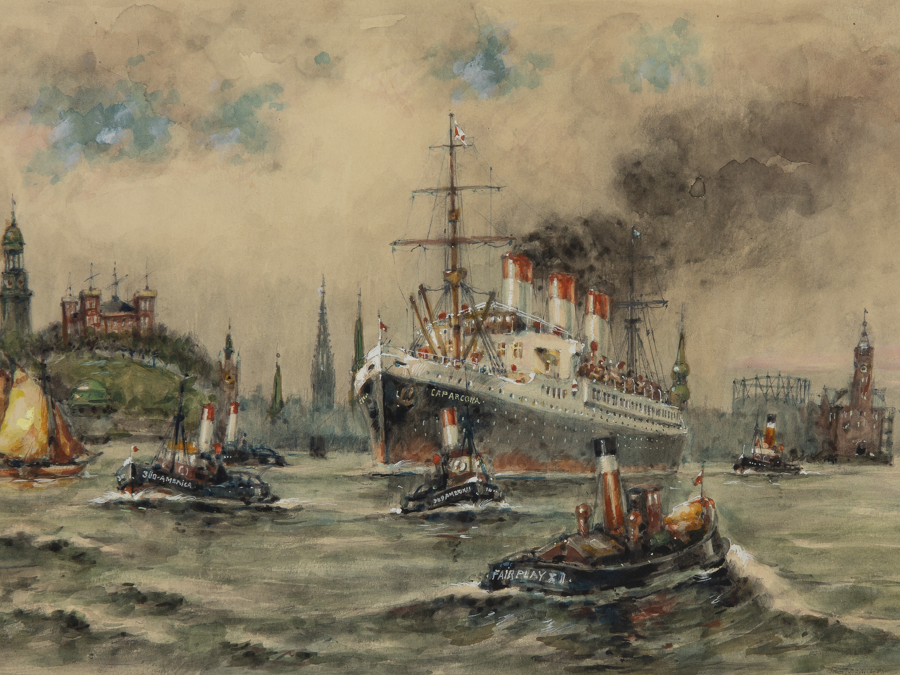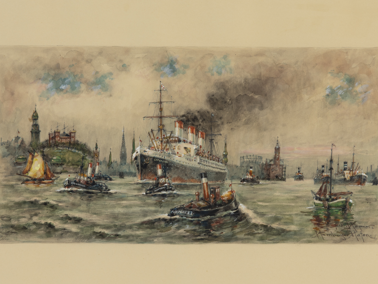 Watercolour with white heightening over pencil sketch on paper; marine painting; lively and detailed harbour panorama before the Hamburg city skyline in the pre-war era, centred on the steamship "Cap Arcona", in the foreground accompanied by small harbour tugs, including those marked "Fairplay X" and "Süd-Amerika"; signed and inscribed lower right "Ferd. Höpner. Hamburger Hafen."; paper slightly light-stained; light narrow frame with various minor bumps; under glass; not opened; image size: approx. 21.5 x 42 cm; frame size: approx. 42.5 x 61.5 cm; weight: 1.3 kg. Shipping exclusively by forwarding agent or at the buyer’s risk.