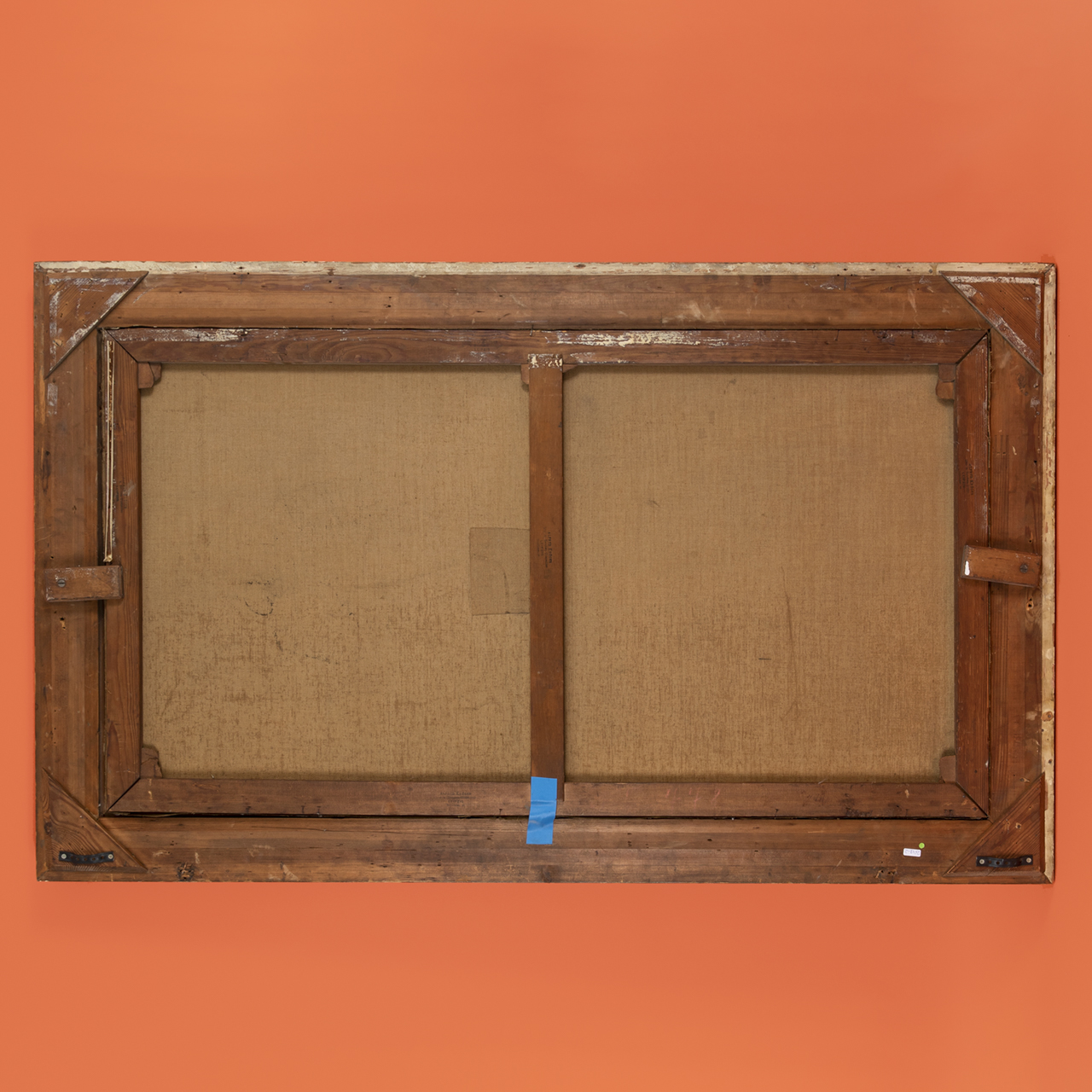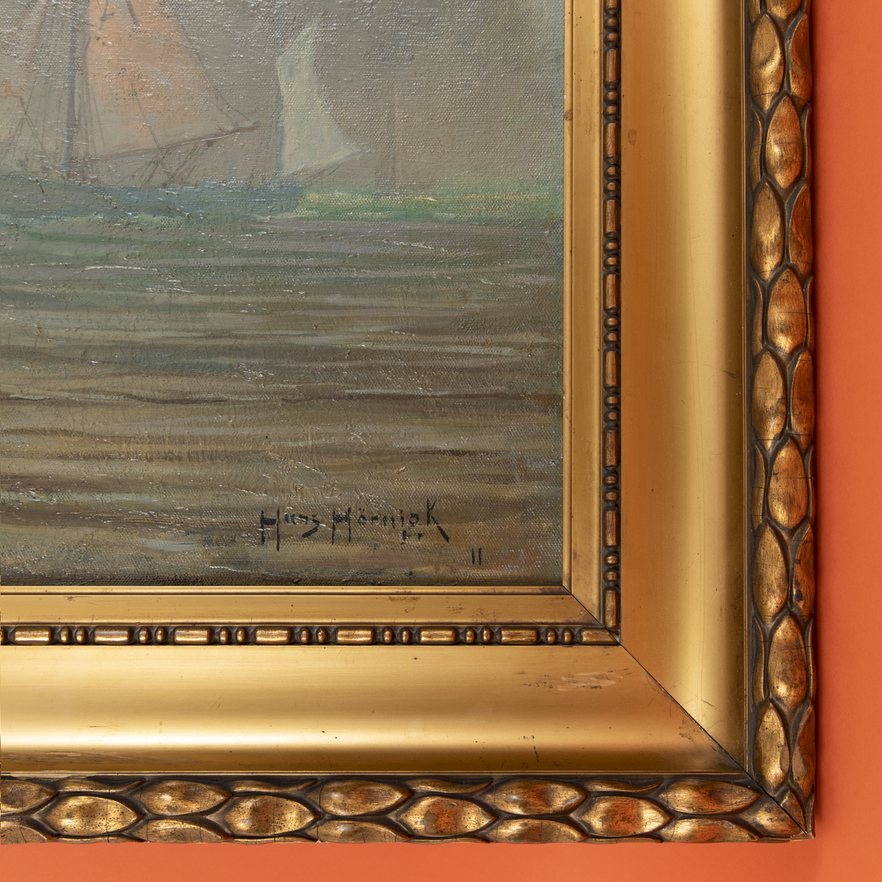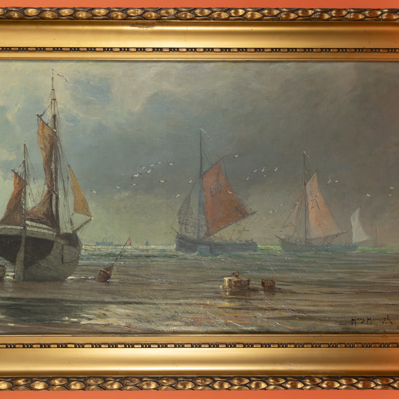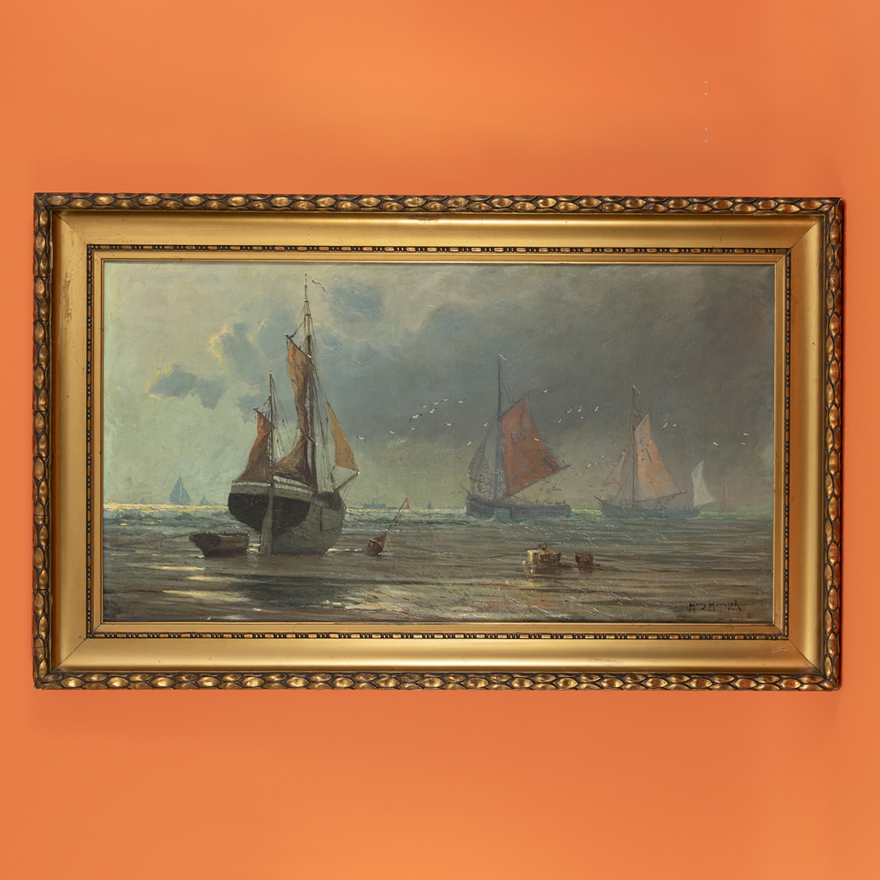 Oil on canvas; marine painting; frog’s-eye view from the beach onto the sea, which in the middle ground is navigated by several sailing ships, in the foreground a sailing ship and a dinghy run aground at low tide under a cloudy sky with flocks of seagulls; signed lower right; partial craquelure; one retouching of approx. 2.5 cm and a restoration in the centre of the painting of approx. 5 cm, patch on the reverse of approx. 12.5 x 10.5 cm; wide, profiled, gilt wooden frame with continuous ornamental décor showing some losses and age-related signs of wear; not opened; age-related signs of wear; painting dimensions: approx. 71 x 130 cm; frame dimensions: approx. 91 x 152 cm; weight: approx. 14.7 kg. Shipping exclusively by forwarding agent or at the buyer’s risk.