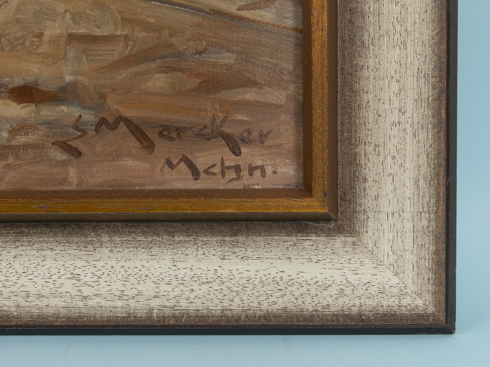Oil on canvas; industrial painting in muted colours; depiction of a large industrial complex with blast furnaces, smoking chimneys and industrial buildings in front of works railway tracks with several tipper wagons; signed lower right and inscribed “Mchn.”; minimal superficial discoloration; double-stepped wooden frame in marbled gold and white tones; not opened; image dimensions: approx. 80.5 x 80.5 cm; frame dimensions: approx. 95 x 95 cm; weight: approx. 3 kg.