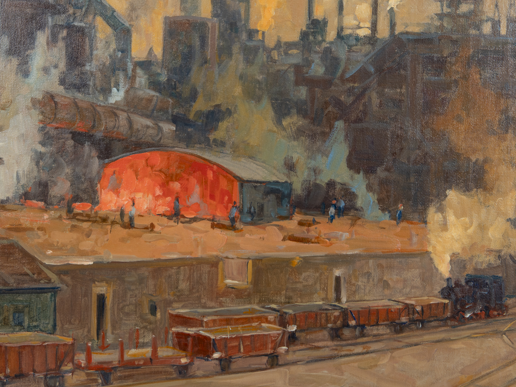 Öl auf Leinwand; Industriemalerei in gedeckten Farben; Darstellung eines großen Industriegeländes mit Hochöfen, rauchenden Schornsteinen und Industriegebäuden vor Werkbahngleisen mit mehreren Loren; unten rechts signiert und bezeichnet „Mchn.“; minimale oberflächliche Verfärbungen; zweifach getreppter Holzrahmen in marmorierenden Gold- und Weißtönen; nicht geöffnet; Bildmaße: ca. 80,5 x 80,5 cm; Rahmenmaße: ca. 95 x 95 cm; Gewicht: ca. 3 kg.