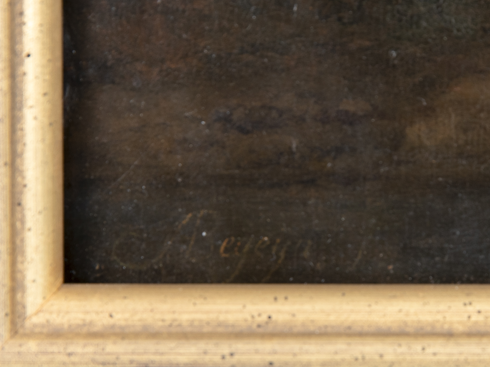 Öl auf Holz; Landschaftsmalerei; Darstellung eines in einem Torbogen einer Aquäduktruine stehenden Hirten vor weiter gebirgiger Landschaft, auf sein Vieh im Vordergrund schauend, das an einem Gewässer tränkt und rast; im Stile von Nicolaes Berchem; unten links unleserlich signiert „ABeyeyn(?)“, im Signaturbereich Restaurationsspuren; altersbedingte Oberflächenverfärbungen und sichtbare Holzmaserungen; breiter, profilierter dunkelbrauner Holzrahmen mit goldenen Akzenten; nicht geöffnet; rückseitig vom Rahmer gestempelt; Bildmaße: ca. 36 x 32,5 cm; Rahmenmaße: ca. 47 x 43 cm; Gesamtgewicht: ca. 1,9 kg.