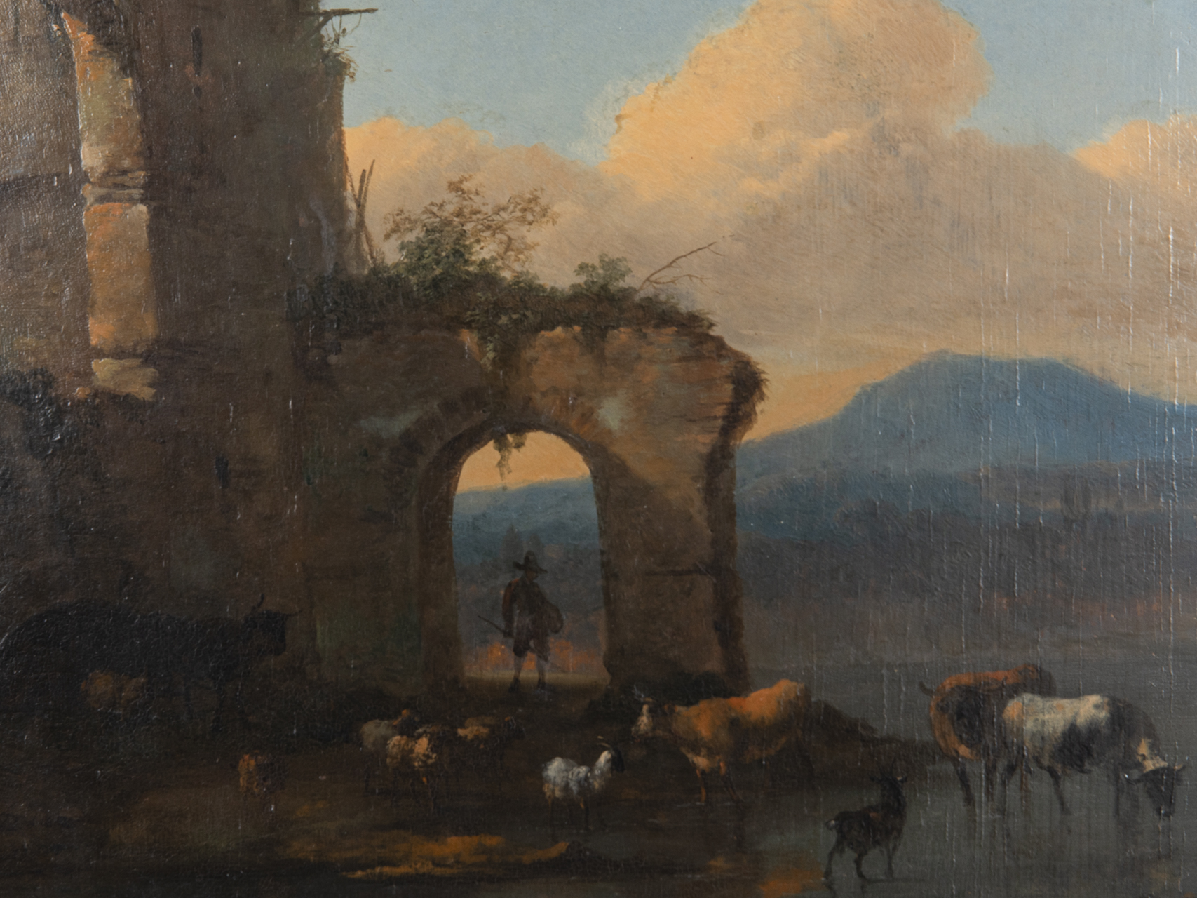 Oil on panel; landscape painting; depiction of a shepherd standing within the archway of an aqueduct ruin before an expansive mountainous landscape, gazing at his livestock in the foreground, which are watering and resting by a body of water; in the style of Nicolaes Berchem; lower left illegibly signed “ABeyeyn(?)”, with restoration traces in the signature area; age-related surface discolouration and visible wood grain; wide, profiled dark brown wooden frame with gilt accents; not opened; reverse stamped by the framer; image dimensions: approx. 36 x 32.5 cm; frame dimensions: approx. 47 x 43 cm; total weight: approx. 1.9 kg.