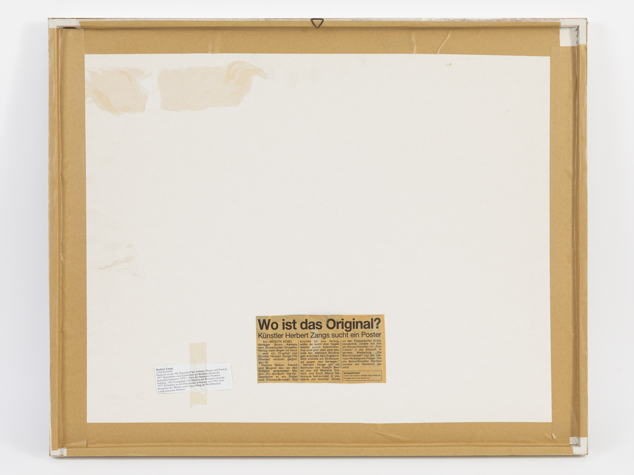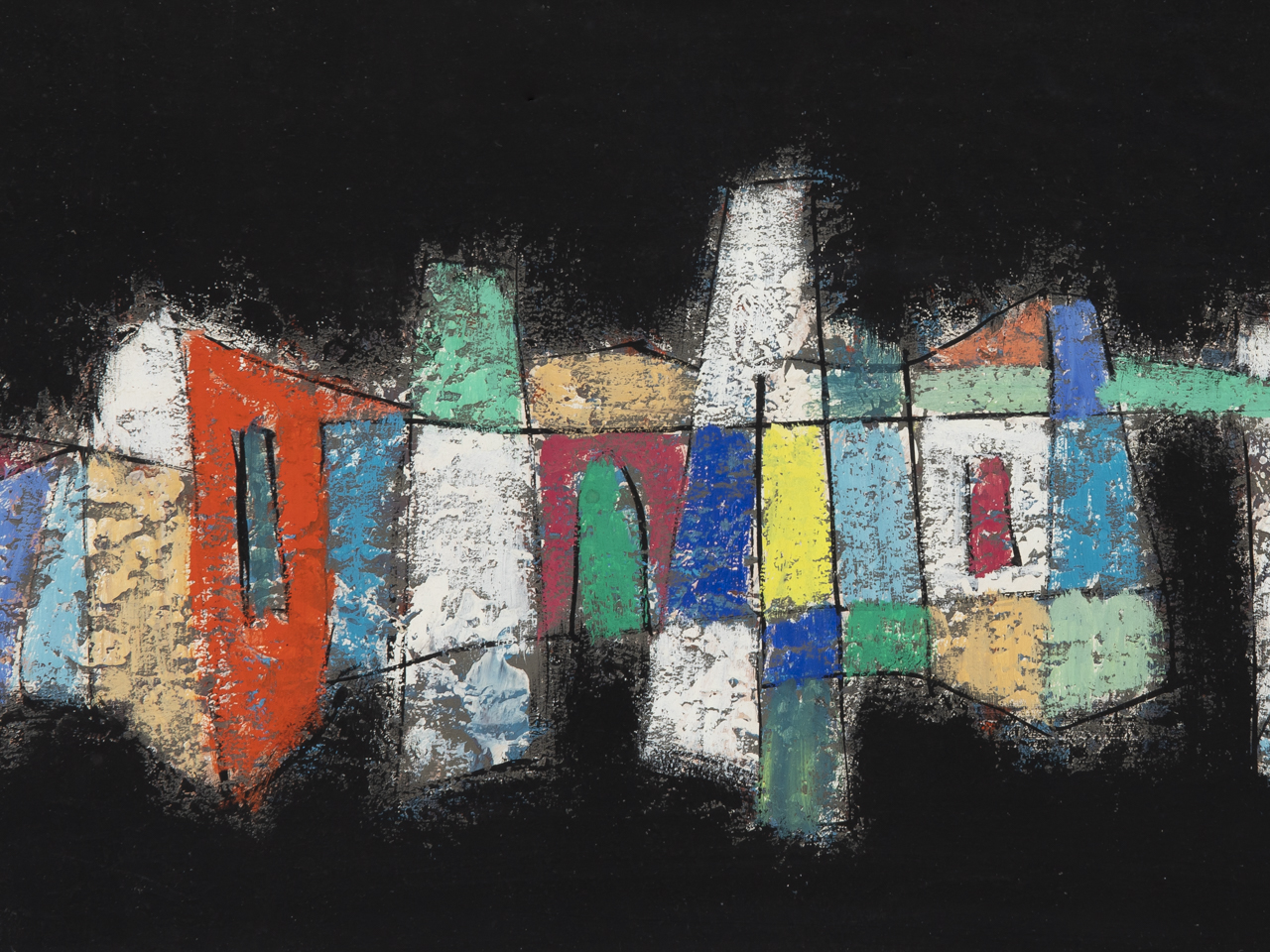 Mixed media on cardboard; abstract architectural painting; depiction of a polychrome row of houses aligned in a single line in the lower half of the composition against a deep black ground; monogrammed lower right "Si"; modern white and silver-coloured wooden frame and white Passepartout; verso inscribed in pencil "Dein lieber Bernd Krefeld" (?); newspaper clipping regarding Herbert Zangs affixed to the reverse; age-related signs of wear and foxing on Passepartout; painting has been opened, probably not in the original frame; image dimensions: approx. 37.4 x 49.7 cm; frame dimensions: approx. 51 x 62 cm; weight: approx. 2.76 kg.