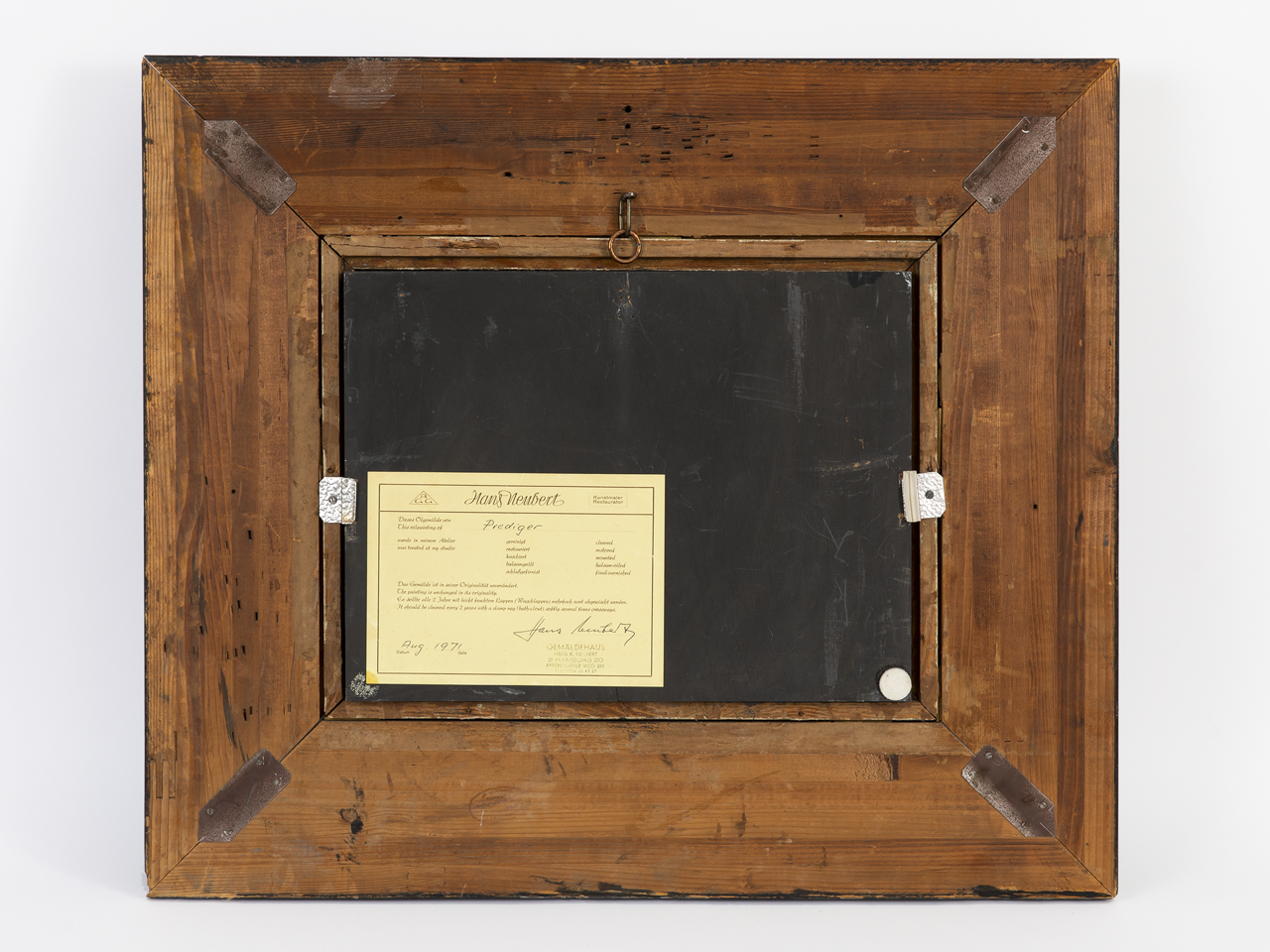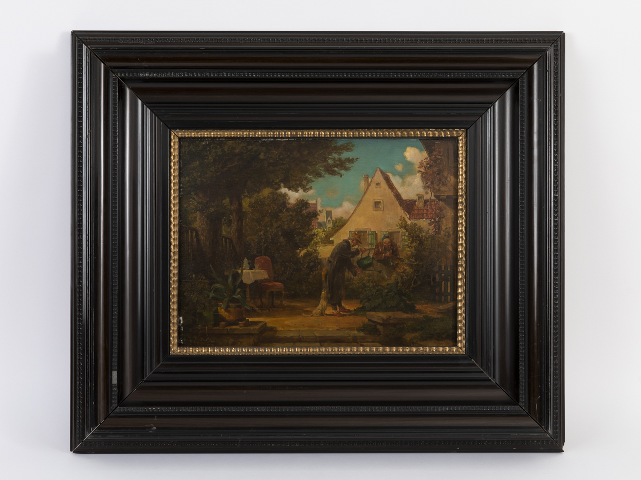 Oil on wood; view onto a town, in the middle ground a house surrounded by a garden landscape with staffage figures in Biedermeier style; lower left signed; paint abrasion lower left; heavy brown-black ebonised wooden frame with various smaller losses; verso with large adhesive label of the painting house Hans Neubert, Hamburg-Eppendorf, Aug. 1971; painting dimensions: approx. 30 x 40 cm; frame dimensions: approx. 58.8 x 69.8 cm; total weight: approx. 6.48 kg.