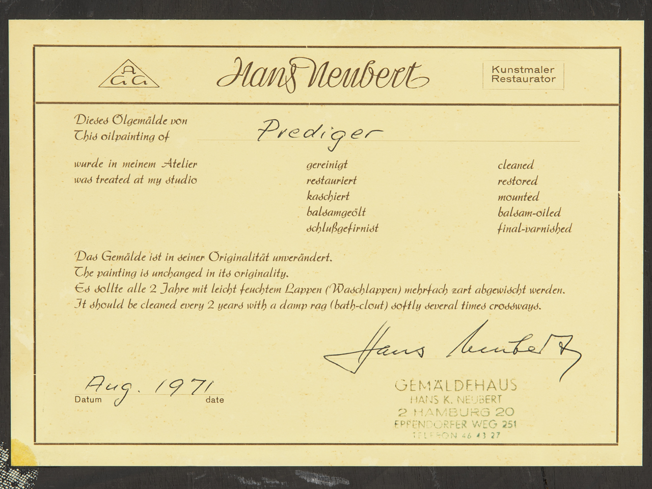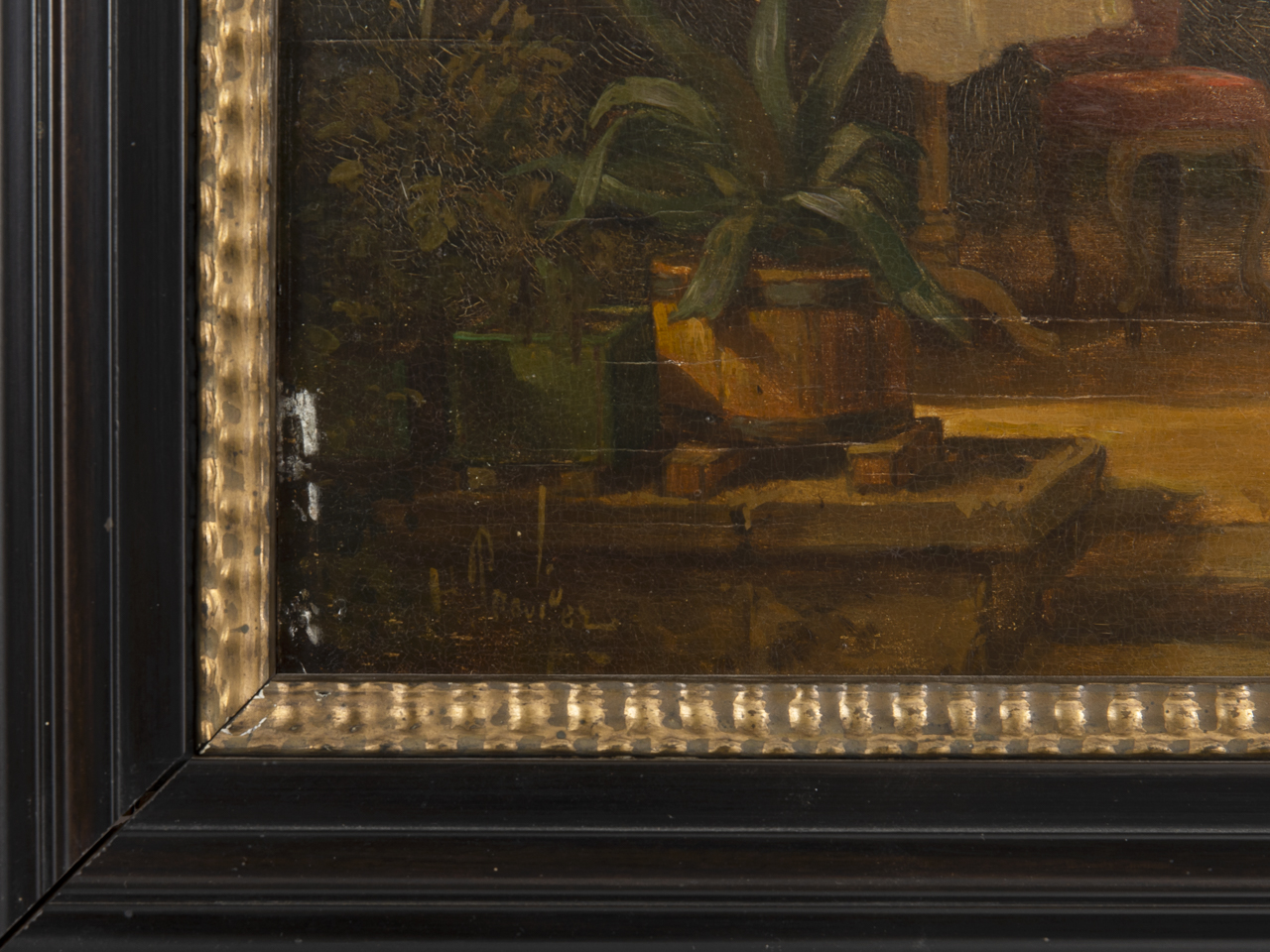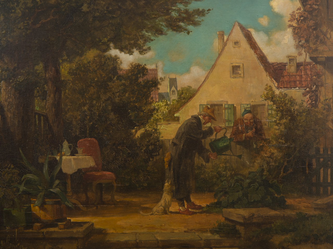 Öl auf Holz; Durchsicht auf eine Stadt, im Mittelgrund stehendes Haus umgeben von einer Gartenlandschaft mit Figurenstaffage im Biedermeierstil; unten links signiert; Farbabrieb unten links; schwerer braun-schwarz ebonisierter Holzrahmen mit diversen kleineren Abplatzungen; rückseitig großes Klebeetikett des Gemäldehauses Hans Neubert, Hamburg-Eppendorf, Aug. 1971; Maße des Bildes: ca. 30 x 40 cm; Rahmenmaße: ca. 58,8 x 69,8 cm; Gesamtgewicht: ca. 6,48 kg.