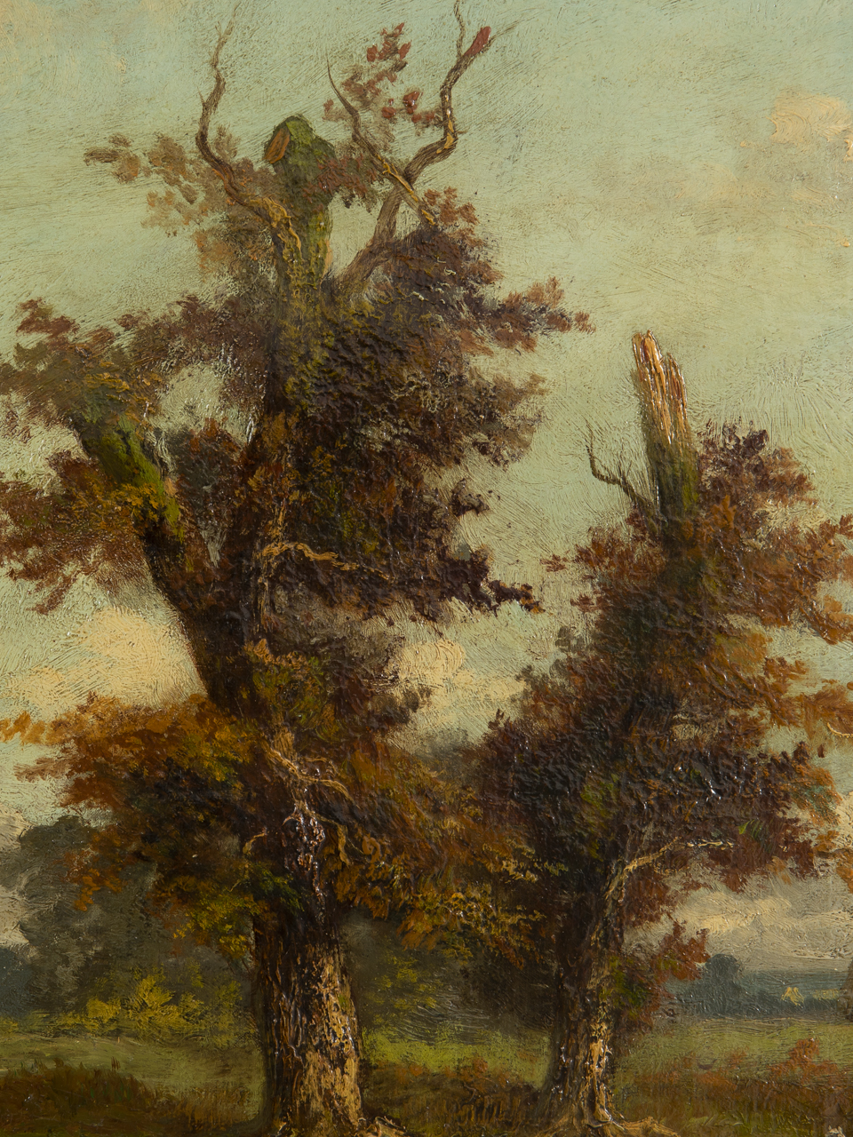 Oil on canvas; moorlandscape under a light blue, slightly cloudy sky with oaks next to a building guarded by a dog; visible brushstroke; canvas slightly warped and with superficial discolourations; broad gilded curved frame; painting dimensions: approx. 38 x 38 cm; frame dimensions: approx. 51.5 x 51.5 cm; weight: approx. 2.2 kg.