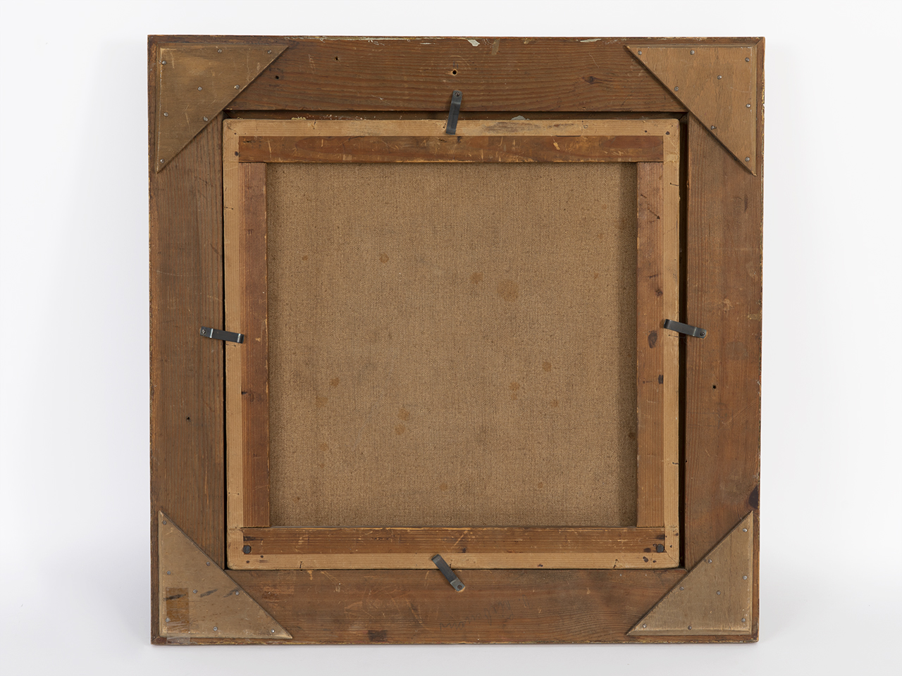Öl auf Leinwand; Moorlandschaft unter hellblauem, leicht bewölktem Himmel mit Eichen neben einem Gebäude, das von einem Hund bewacht wird; sichtbarer Pinselduktus; Leinwand leicht gewellt und mit oberflächlichen Verfärbungen; breiter goldfarbener, geschwungener Rahmen; Bildmaße: ca. 38 x 38 cm; Rahmenmaße: ca. 51,5 x 51,5 cm; Gewicht: ca. 2,2 kg.