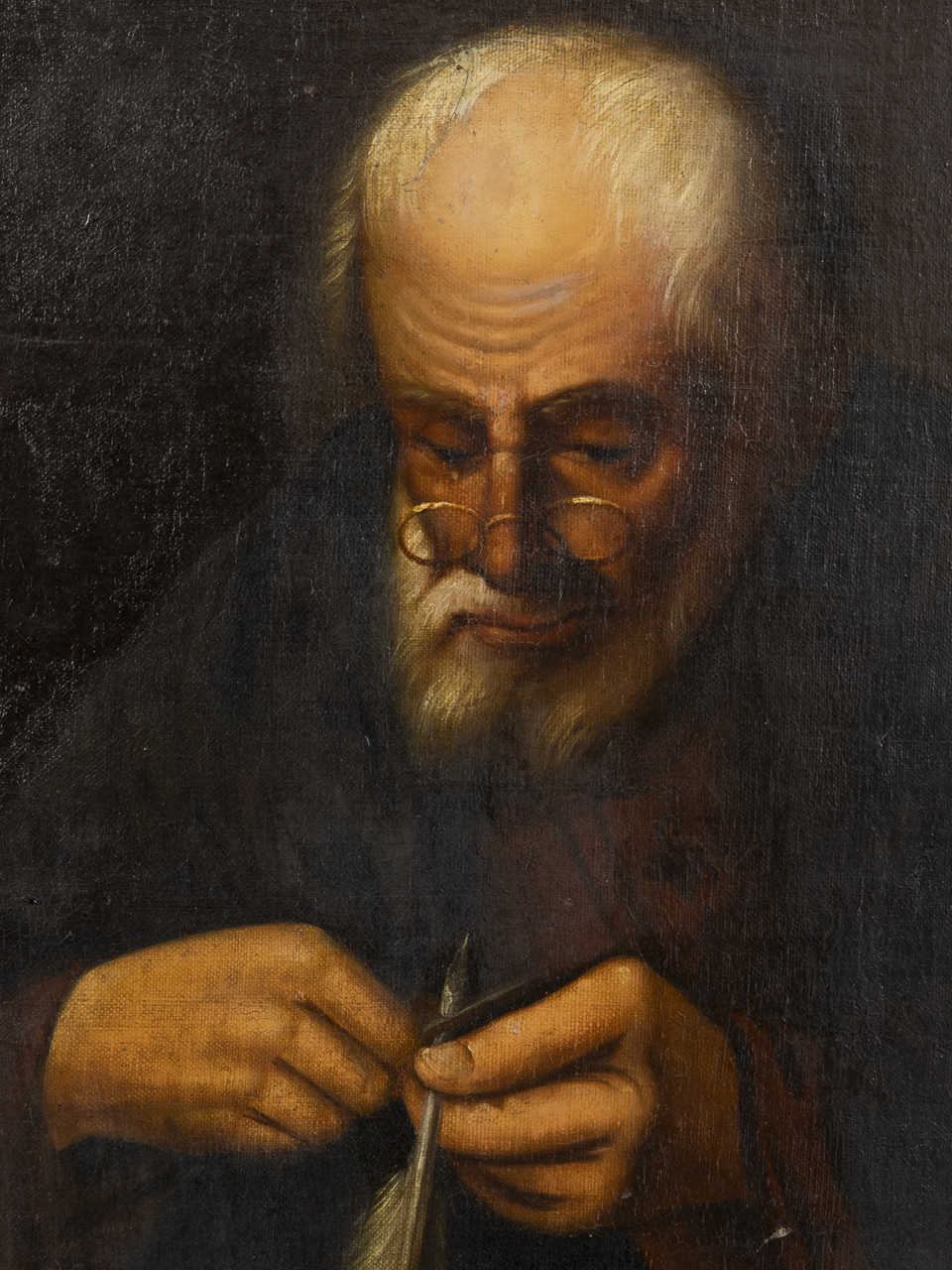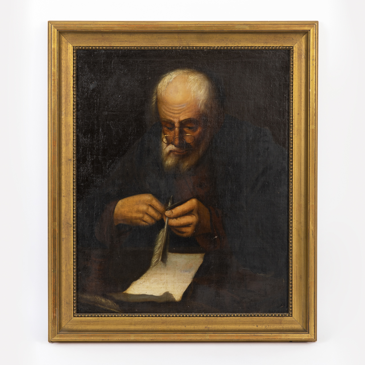Öl auf Leinwand; realistische Porträtmalerei; Rollenporträt in Frontalansicht eines betagten Gelehrten beim Spitzen seiner Schreibfeder; diverse Retuschen und Restaurierungen; rückseitig Klebeetikett mit kyrillischer Beschriftung; nicht geöffnet; Bildmaße: 55 x 45 cm; Rahmenmaße: 65 x 56 cm; Gewicht: 4,7 kg; Versand ausschließlich per Spedition oder auf Risiko des Käufers.