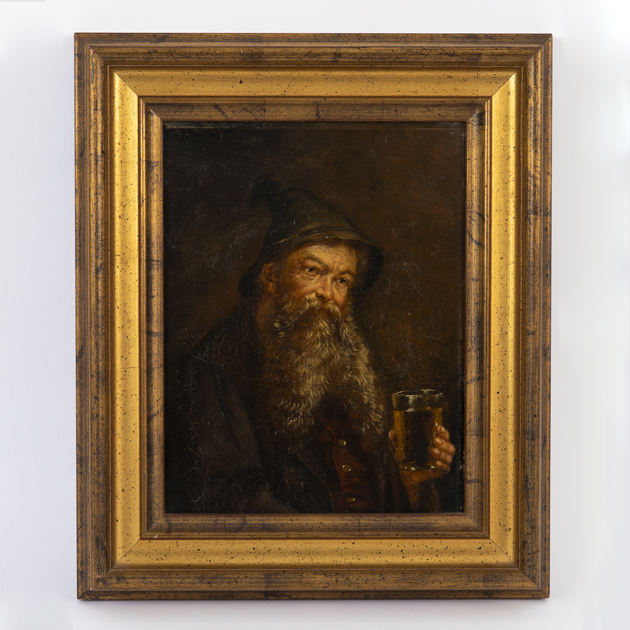 Oil on canvas; portrait of a bearded man wearing a green traditional hat, holding a beer glass; upper left illegibly signed; stretcher mark along the right and upper edges as well as minor paint losses and fine craquelure; painting dimensions: approx. 27 x 21 cm; frame dimensions: approx. 38.5 x 32.5 cm; weight: approx. 1.4 kg.