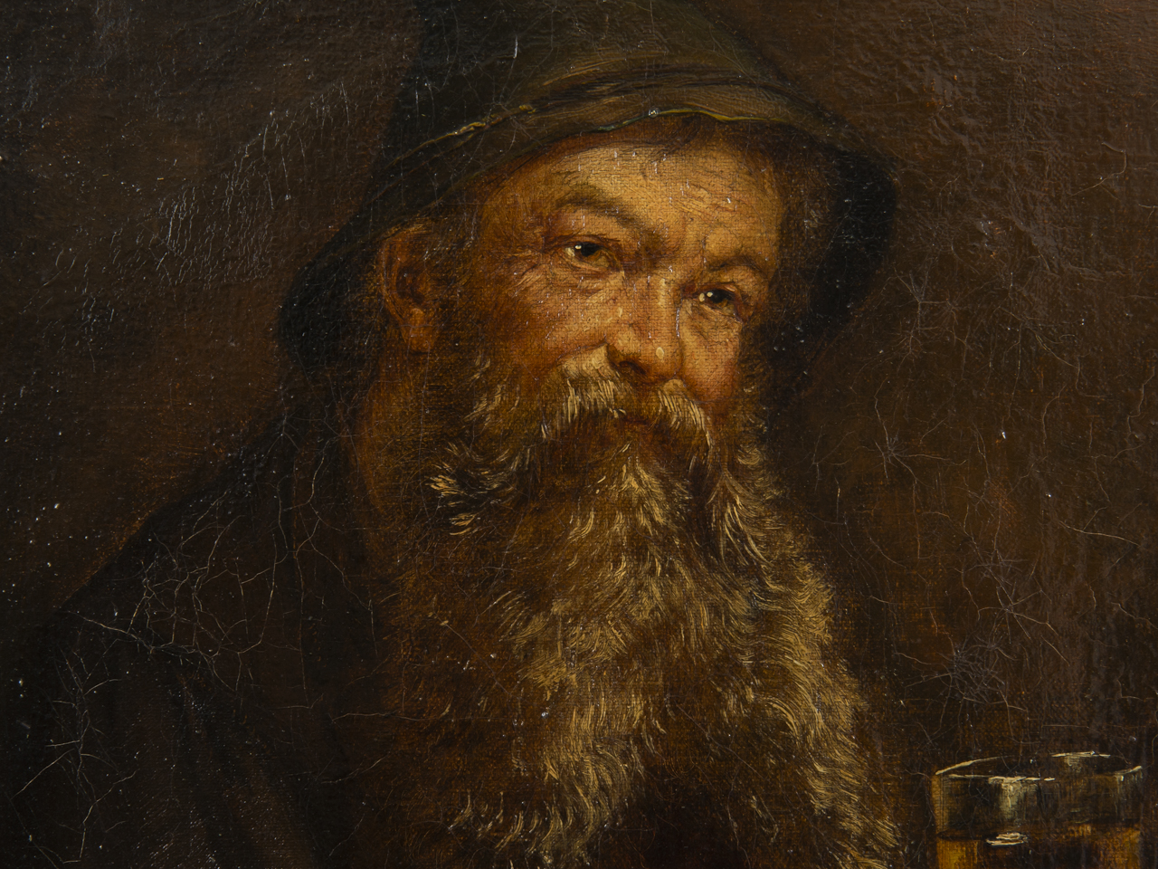 Öl auf Leinwand; Porträt eines bärtigen Mannes mit grünem Trachtenhut, ein Bierglas in der Hand haltend; oben links unleserlich signiert; am rechten und oberen Rand Keilrahmenabdruck sowie minimale Farbabplatzungen und feines Craquelé; Bildmaße: ca. 27 x 21 cm; Rahmenmaße: ca. 38,5 x 32,5 cm; Gewicht: ca. 1,4 kg.