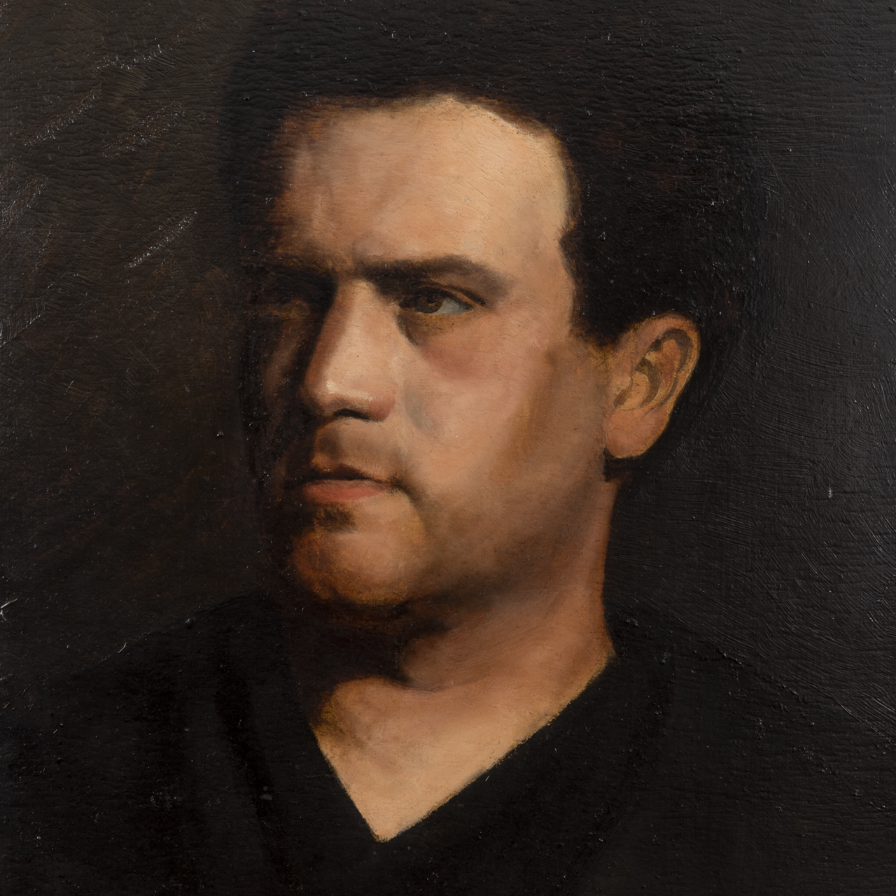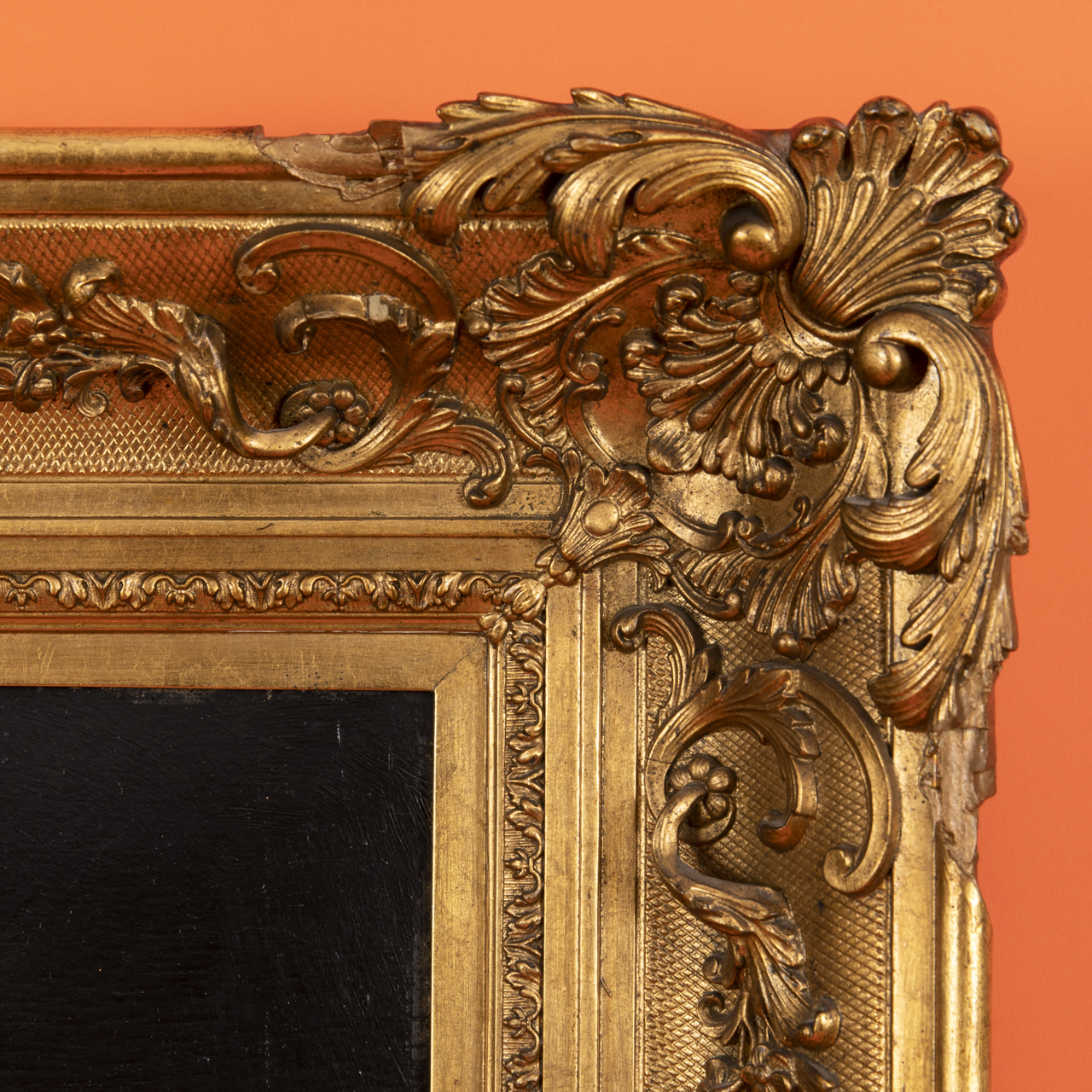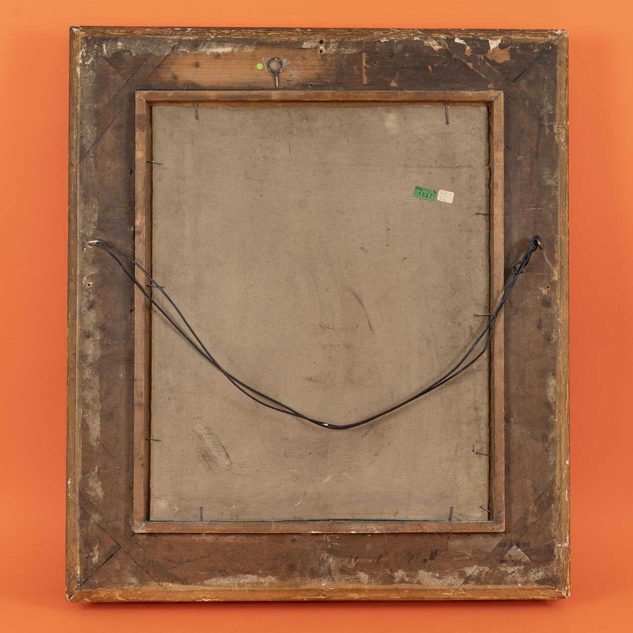 Oil on artist’s board, relined; realistic portrait painting; male portrait; shoulder-length depiction in half-profile; portrayal of a middle-aged man in dark clothing against a dark background; several restoration traces, especially in the lower area of the painting; reverse inscribed in pencil “Schlabitz Berlin” and with two numbered paper labels; gilded ornate frame with floral and ornamental décor; age-related signs of wear; painting dimensions: approx. 59 x 47 cm; frame dimensions: approx. 82 x 72 cm; weight: approx. 7.6 kg.