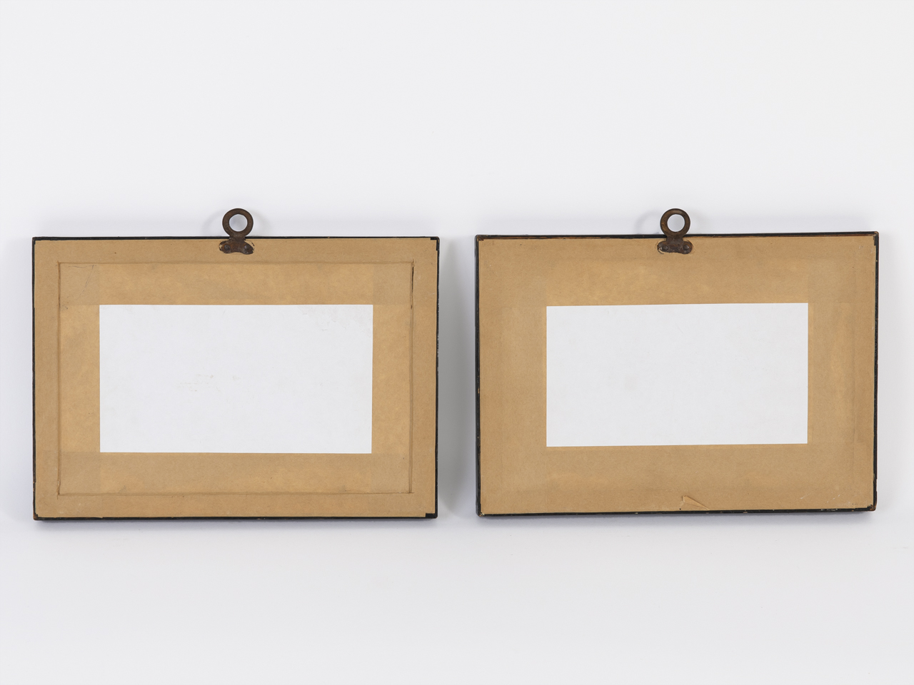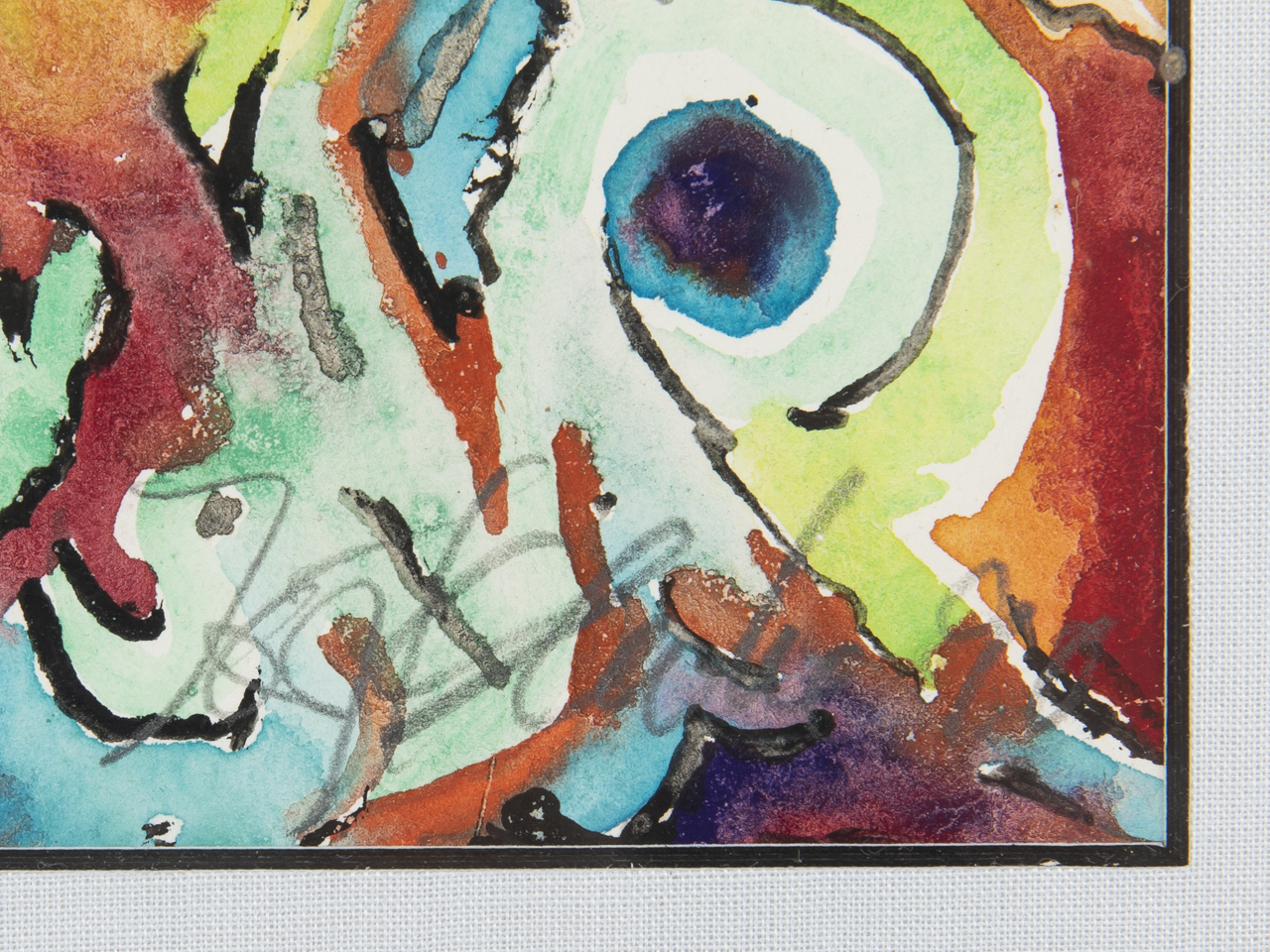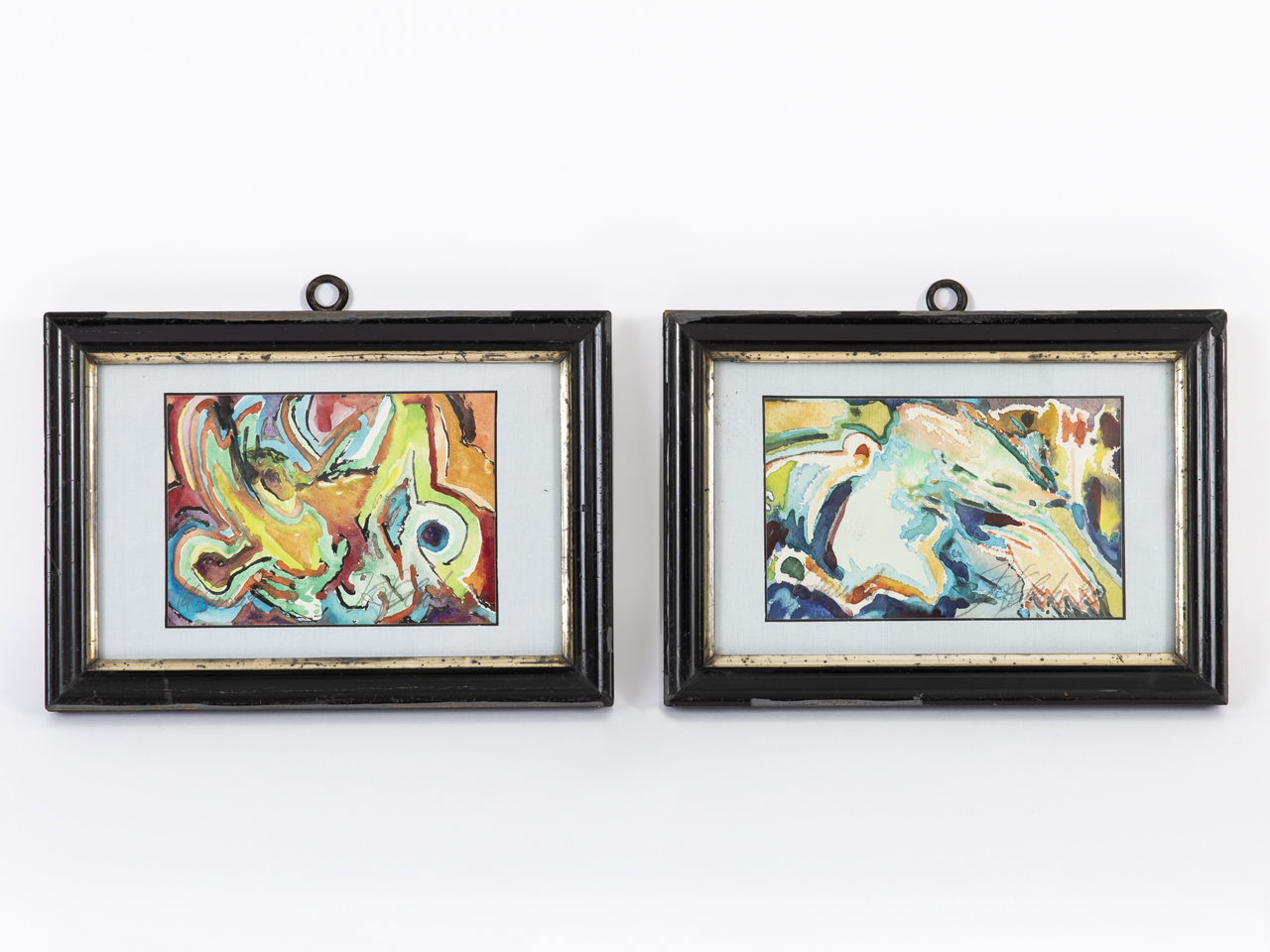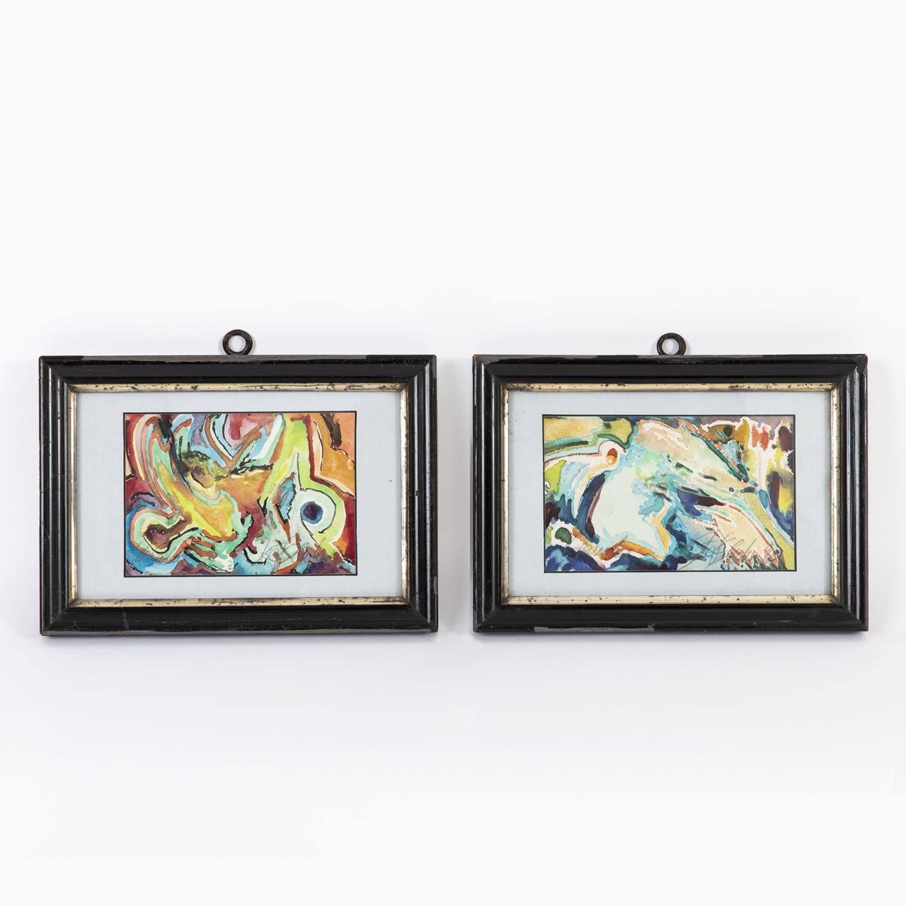 Watercolour on paper; abstract geometric compositions in a colouristic concept; lower left in each titled in pencil “Kraniche” and “Kl. Sabal” (?), lower right in each illegibly signed “J. Kafflacke” (?); both with light grey fabric-covered gallery passepartouts; both in ebonised wooden frames with silver-coloured inner edge, both with several bumps; age-related signs of wear; not opened; image section dimensions: approx. 9.5 x 15.5 cm and 10 x 14 cm respectively; frame dimensions: approx. 17 x 24 cm; total weight: approx. 745 g.